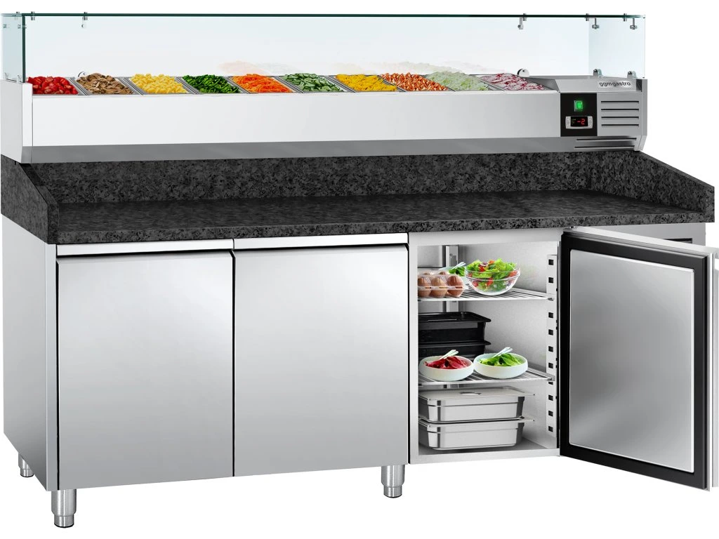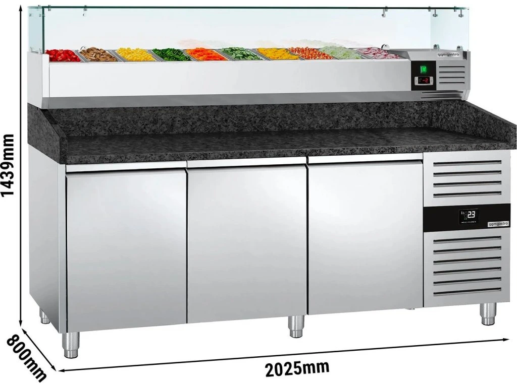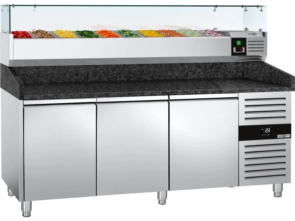 Stół chłodniczy do pizzy PREMIUM - 2000x800mm - z 3 drzwiami - włącznie z witryną chłodniczą nadstawną - 10x GN 1/4
