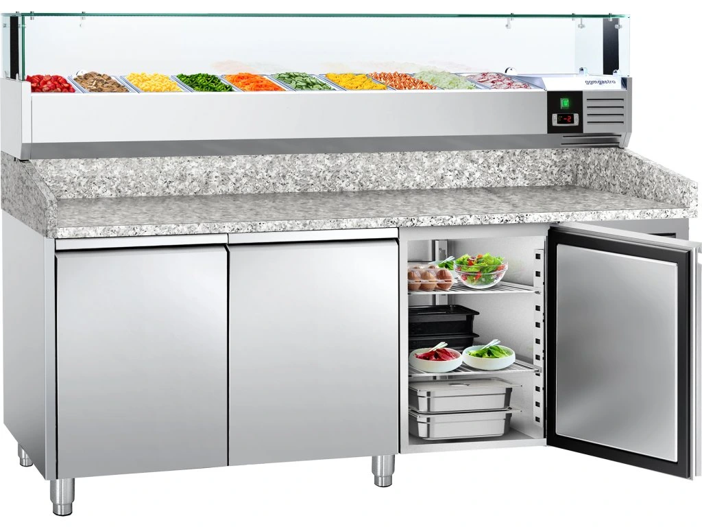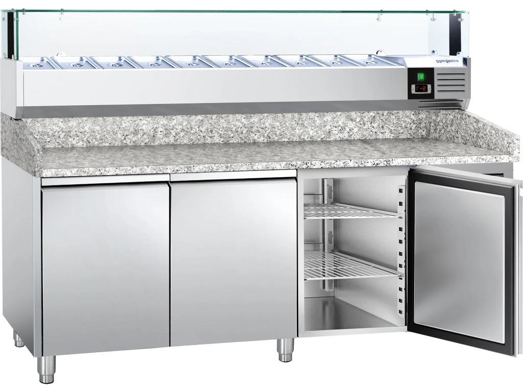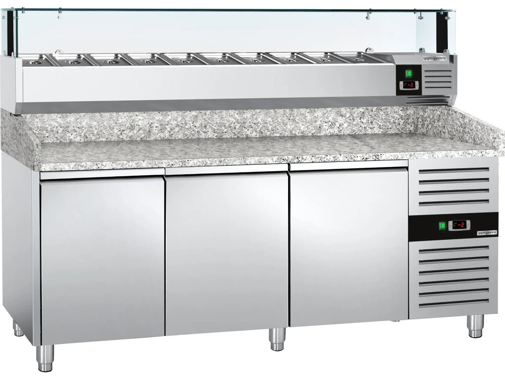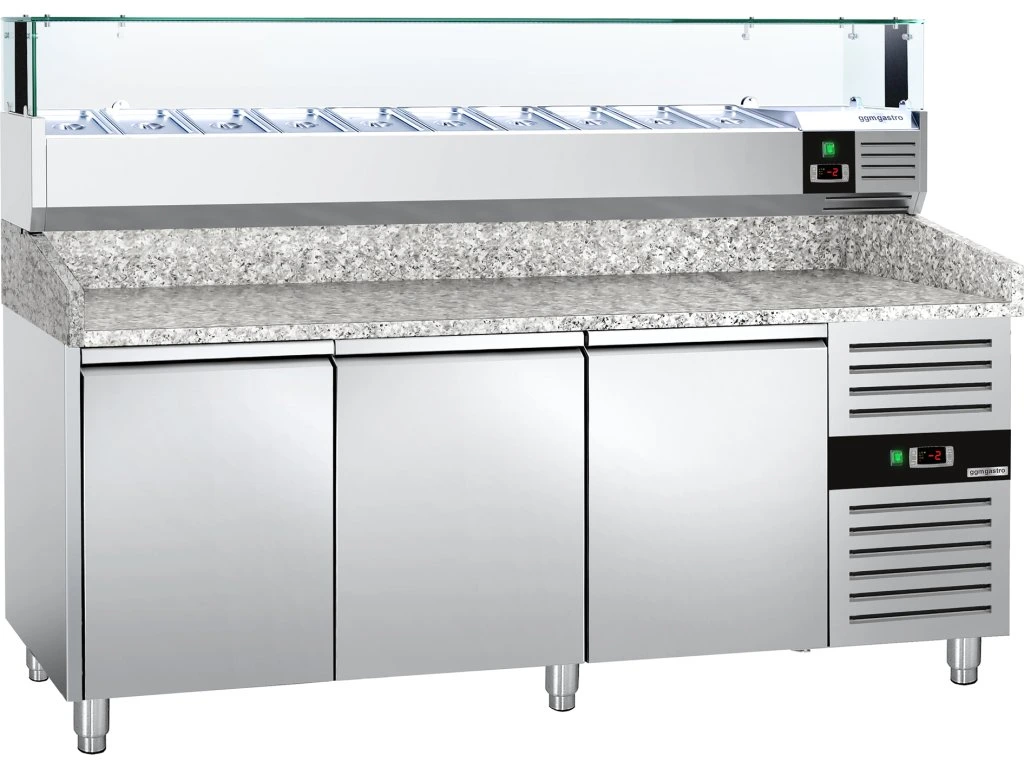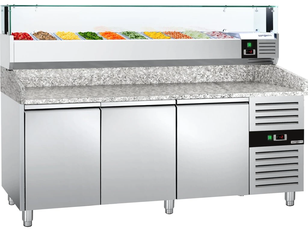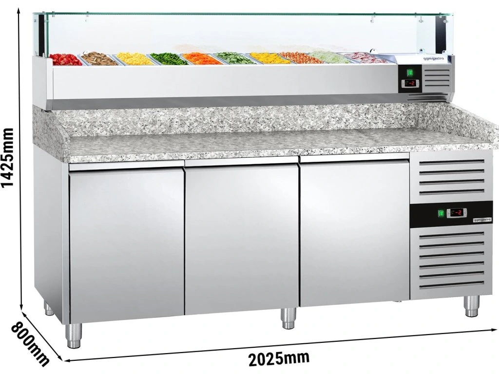 Stół chłodniczy do pizzy PREMIUM - 2000x800mm - z 3 drzwiami - włącznie z witryną chłodniczą nadstawną LED - 10x GN 1/4
