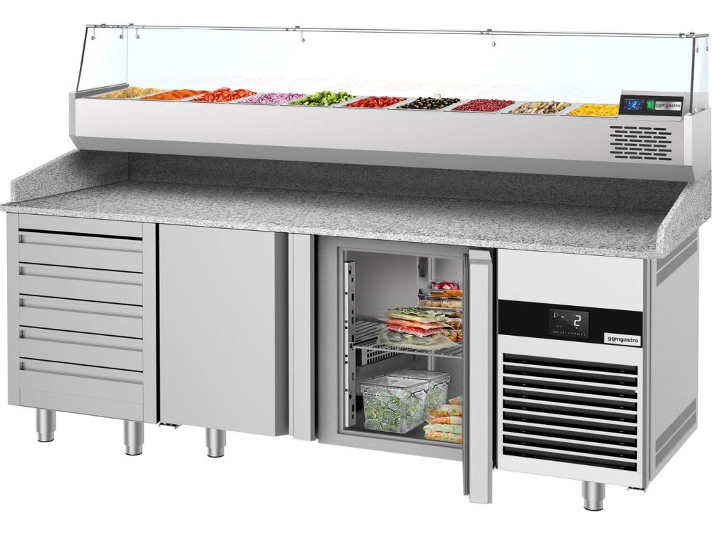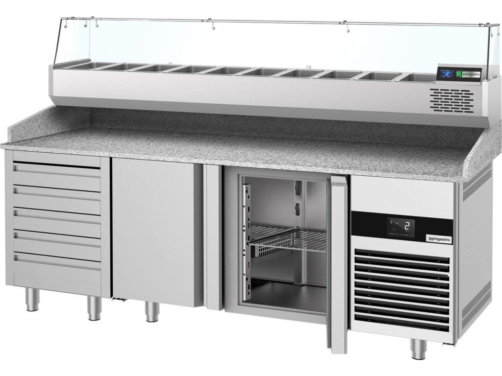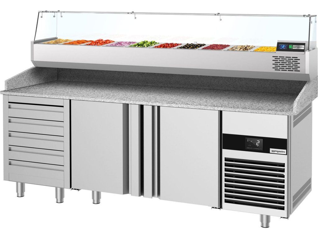 Stół chłodniczy do pizzy PREMIUM - 2100x800mm - z 3 drzwiami & 7 szufladami - włącznie z witryną chłodniczą nadstawną - 10x GN 1/3