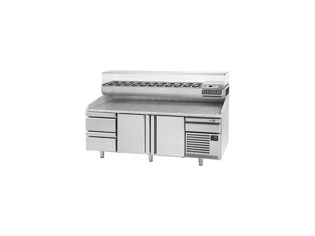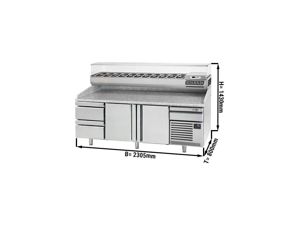 Stół chłodniczy do pizzy PREMIUM PLUS - 2305x800mm - z 2 drzwiami & 2 szufladami - włącznie z witryną chłodniczą nadstawną - 11x GN 1/4