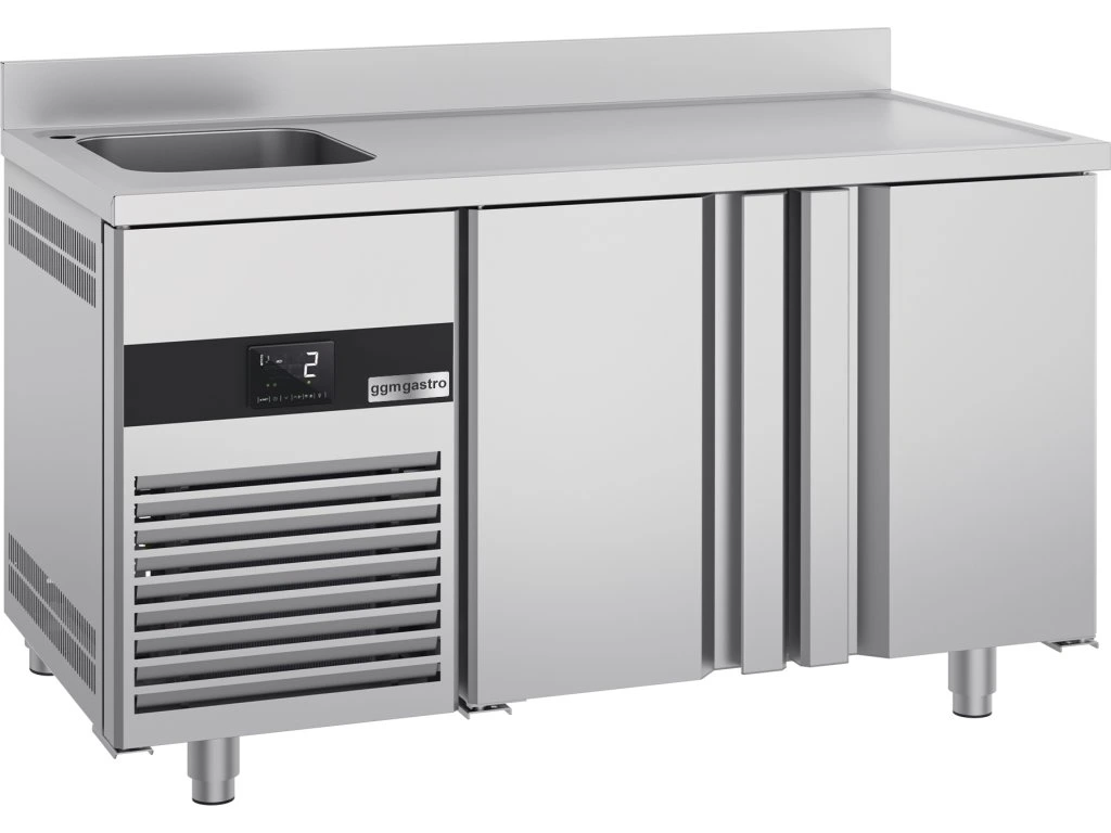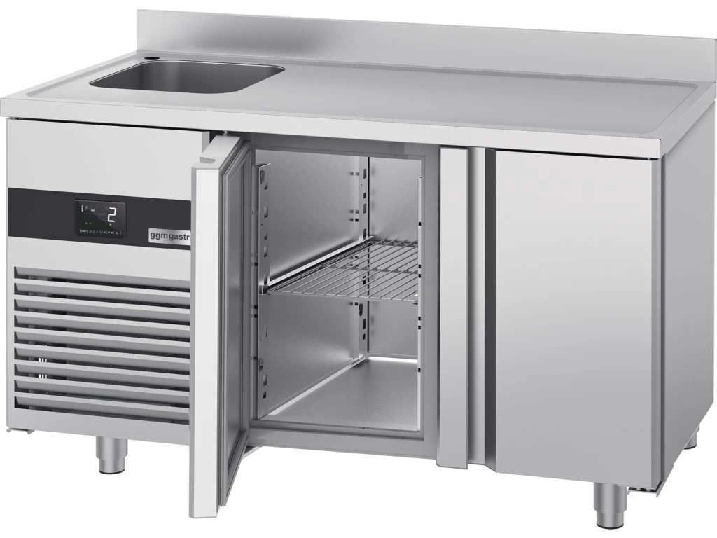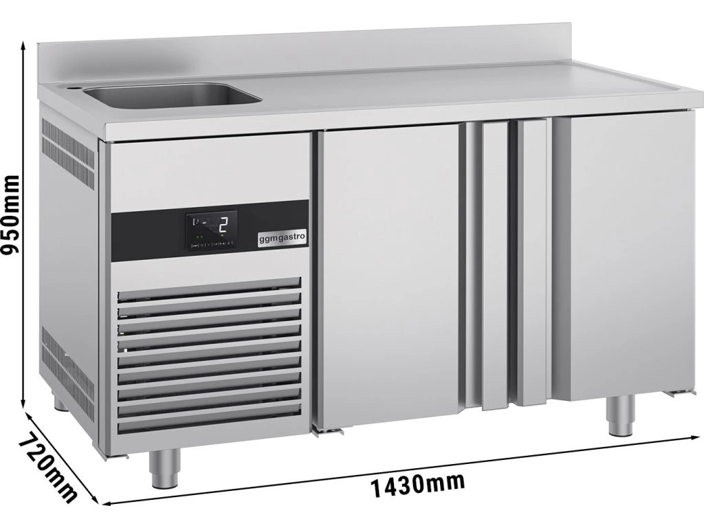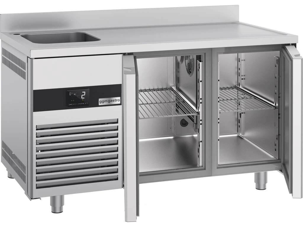 Stół chłodniczy PREMIUM - 1430x700 mm - z 2 drzwiami, 1 zlewem po lewej stronie & panelem tylnym