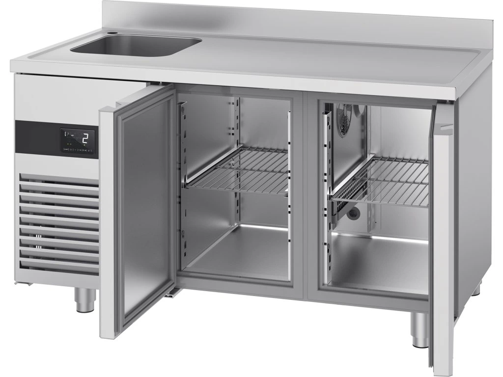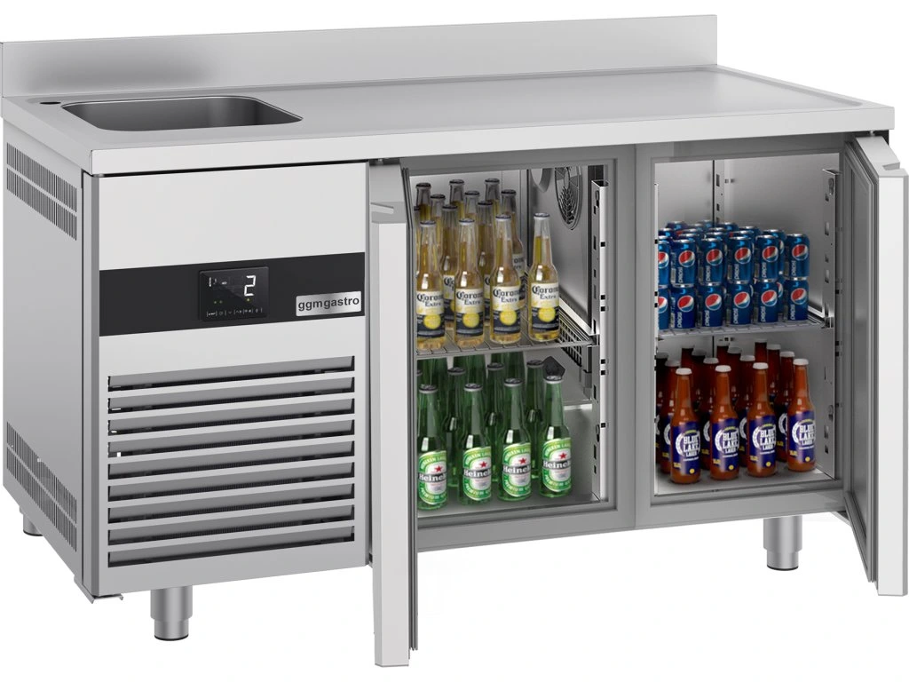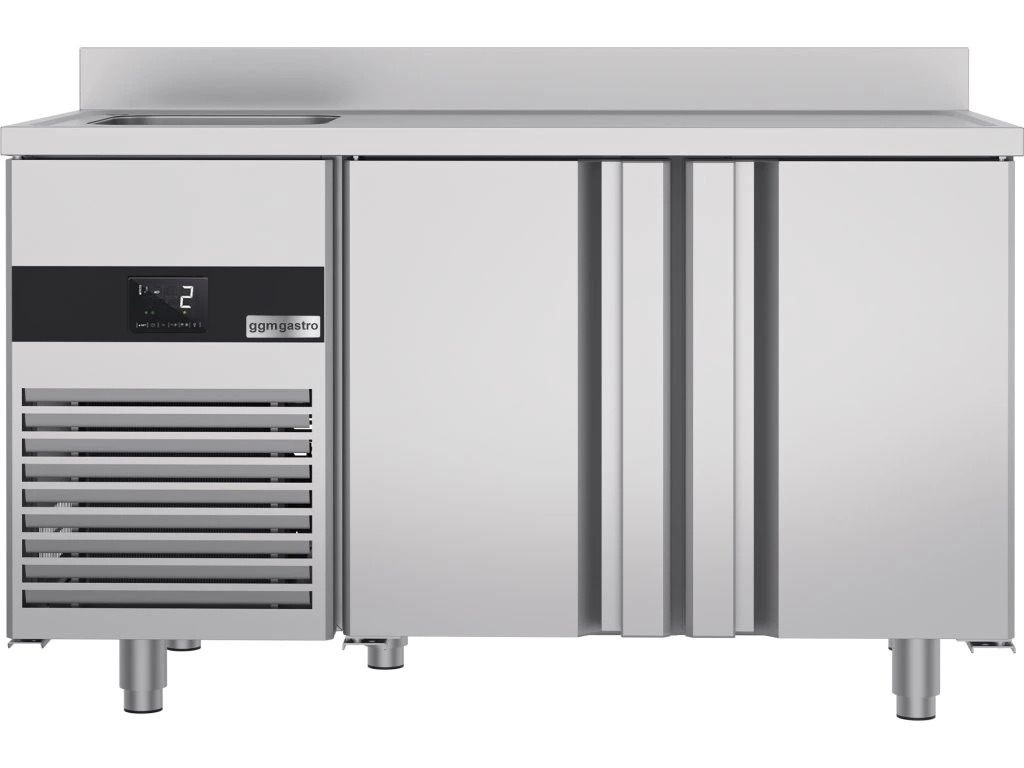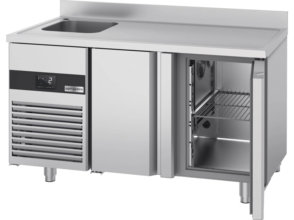 Stół chłodniczy PREMIUM - 1430x700 mm - z 2 drzwiami, 1 zlewem po lewej stronie & panelem tylnym