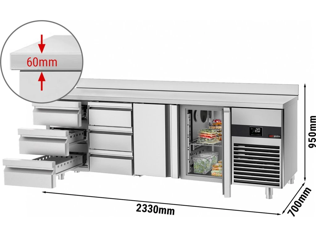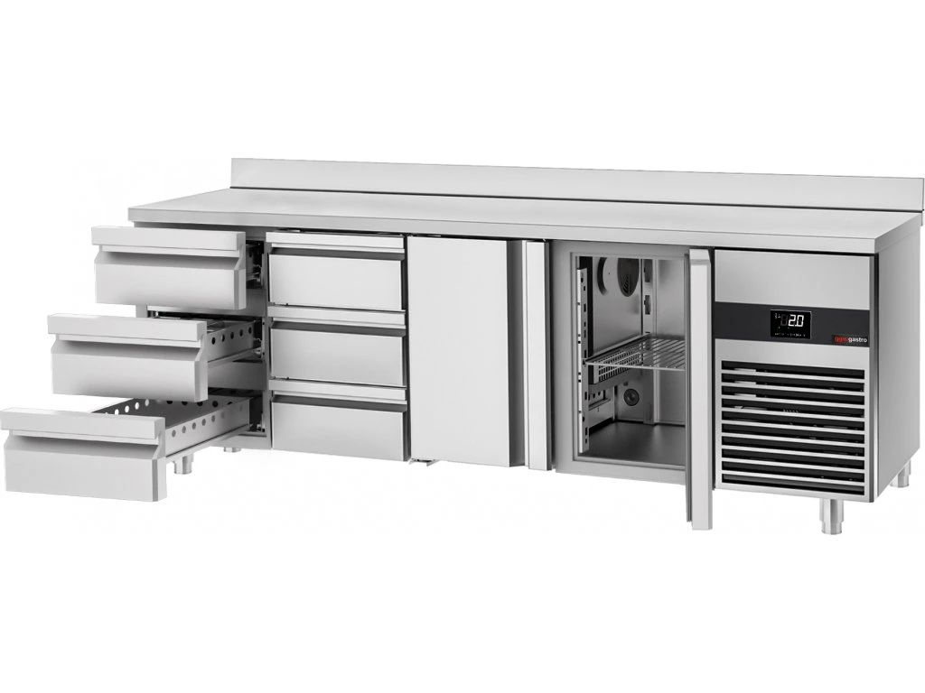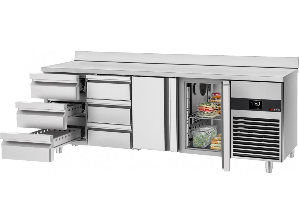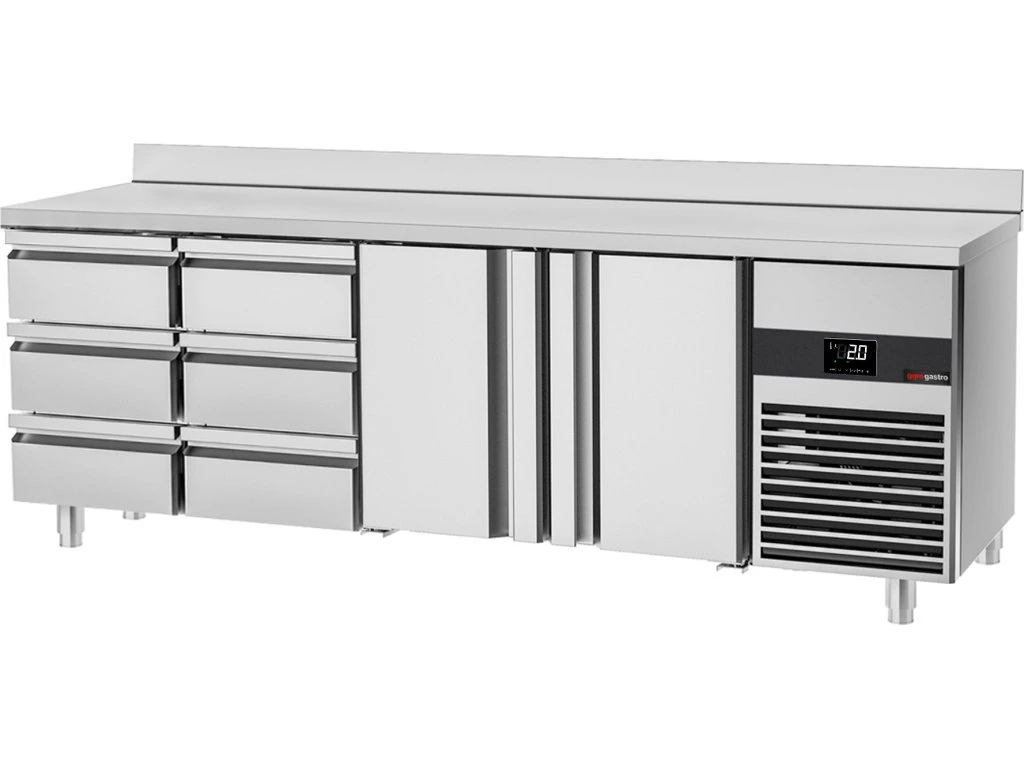 Stół chłodniczy PREMIUM - 2330x700 mm - z 2 drzwiami & 6 szufladami & panelem tylnym