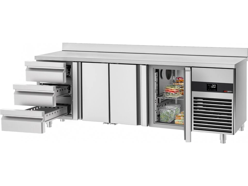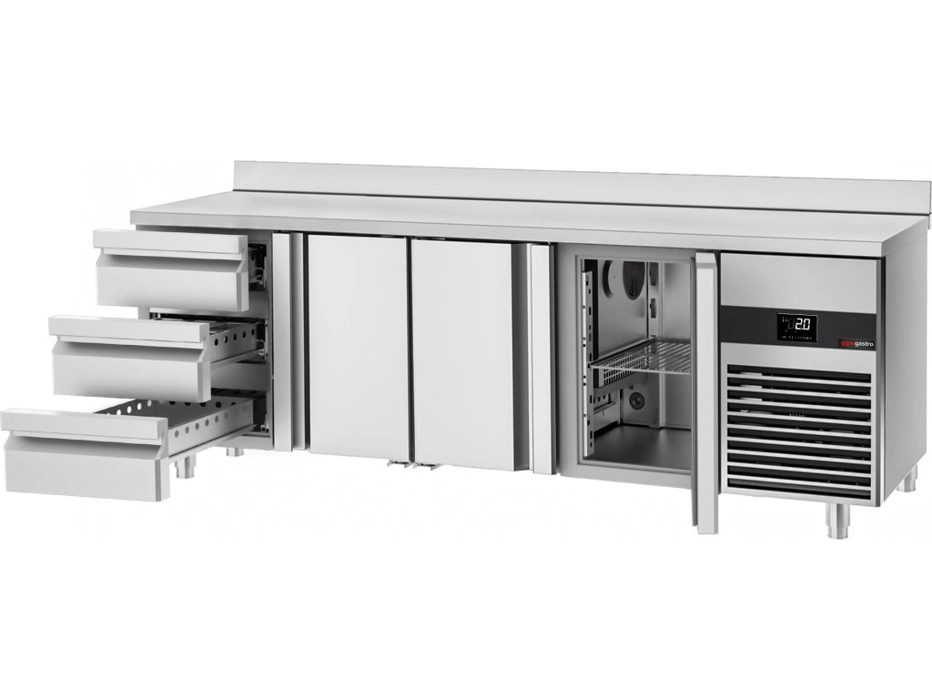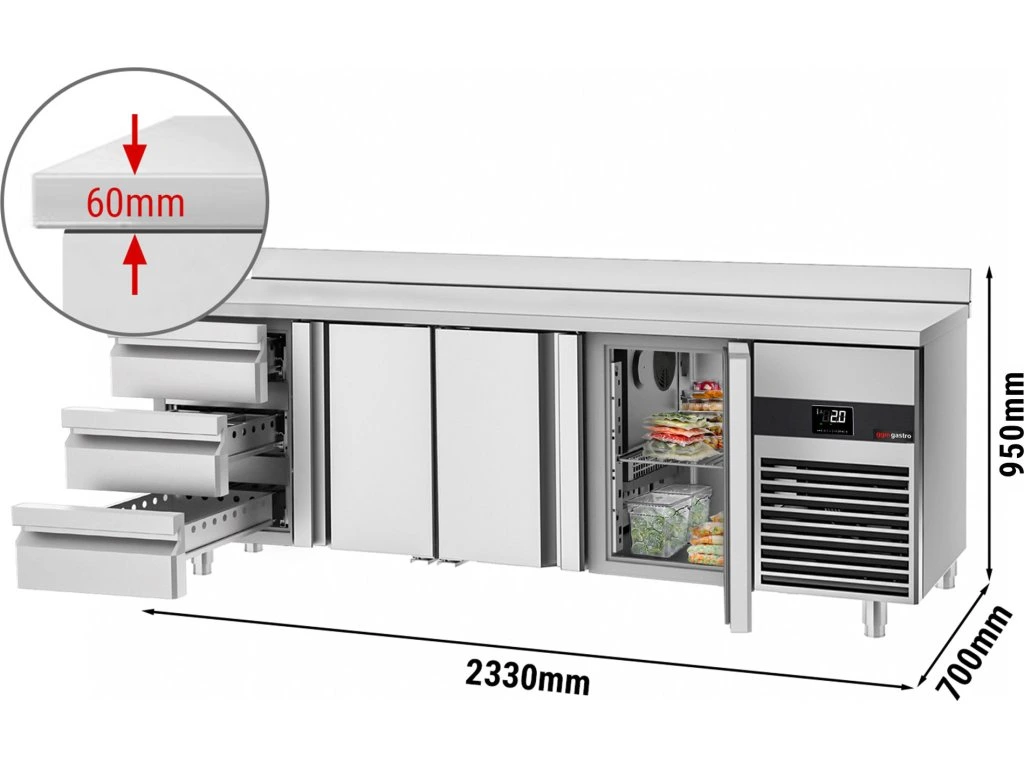 Stół chłodniczy PREMIUM - 2330x700 mm - z 3 drzwiami & 3 szufladami & panelem tylnym