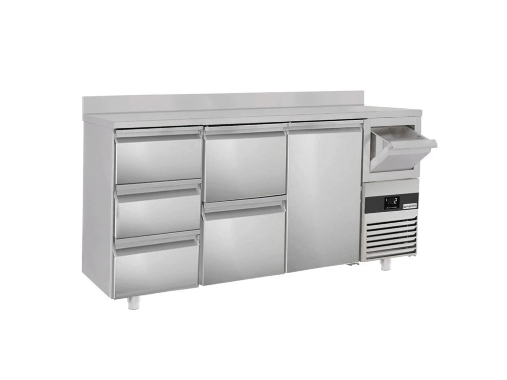 Stół chłodniczy PREMIUM do baru i napojów - 2130x600 mm - 1 drzwi, 5 szuflad, panel tylny i kołatka do kawy