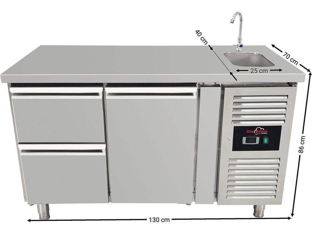 Stół chłodniczy ze zlewem, 1 drzwiami i 2 szufladami po lewej stronie