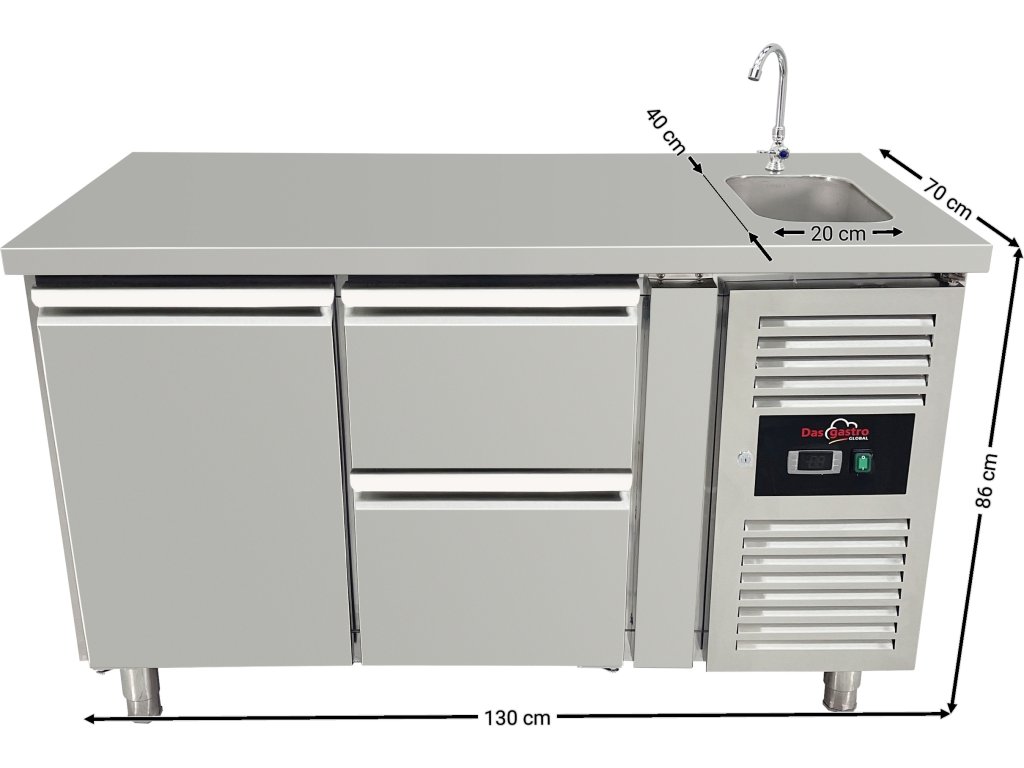 Stół chłodniczy ze zlewem, 1 drzwiami i 2 szufladami po prawej stronie