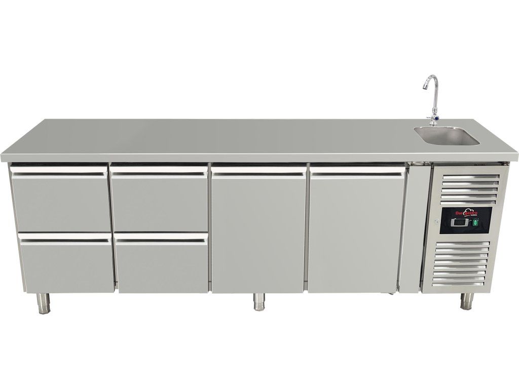 Stół chłodniczy ze zlewem, 2 drzwiami i 4 szufladami po lewej stronie