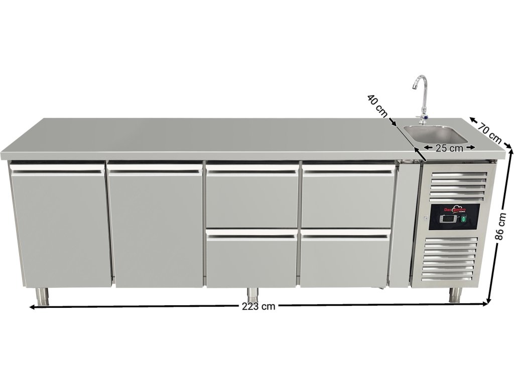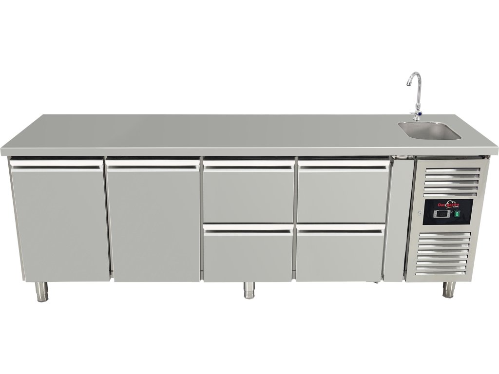 Stół chłodniczy ze zlewem, 2 drzwiami i 4 szufladami po prawej stronie