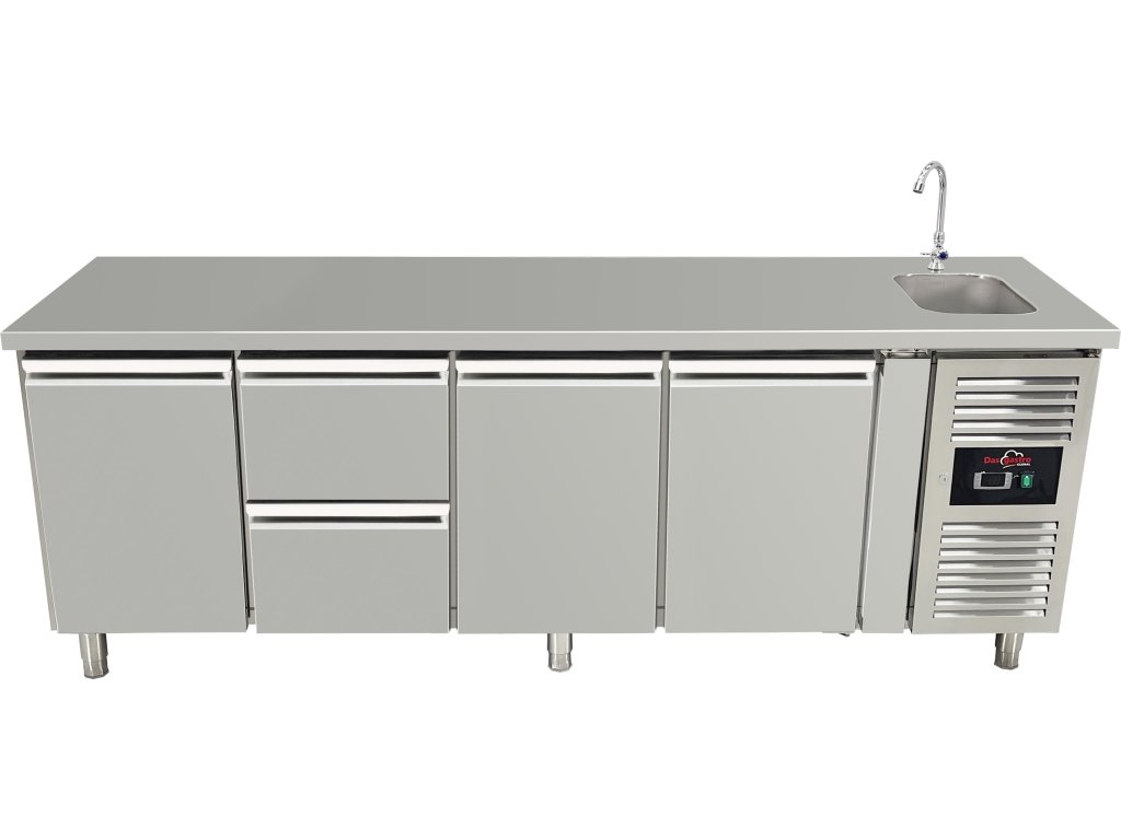 Model DAS4100TNSTRE to połączenie wydajnego urządzenia chłodniczego i praktycznego zlewu. Nadaje się do zastosowań, w których potrzebna jest duża przestrzeń do przechowywania chłodzonej żywności i jednocześnie strefa mycia zintegrowana w jedną funkcjonalną całość.