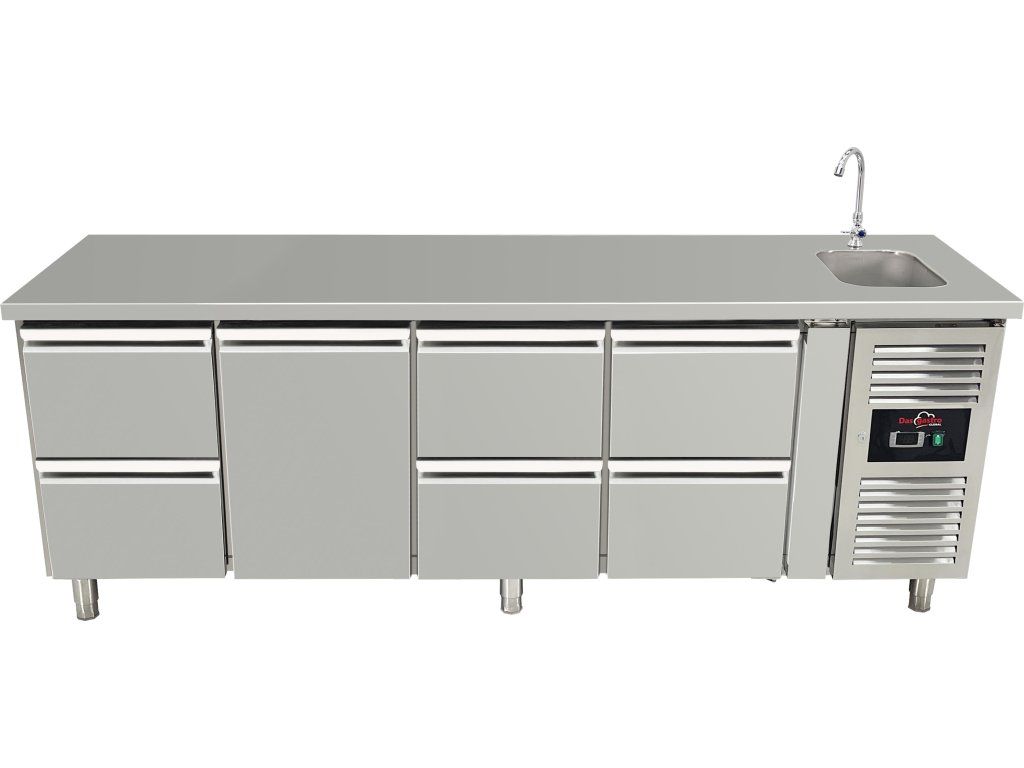 Stół chłodniczy ze zlewem - 6 szuflad i środkowe drzwi po lewej stronie