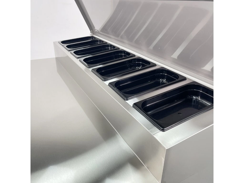 Górna powierzchnia przystosowana do umieszczania pojemników GN - mieści 5 szt. GN 1/3 + 1 szt. GN 1/2 (maksymalna głębokość 15 cm)