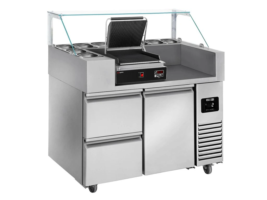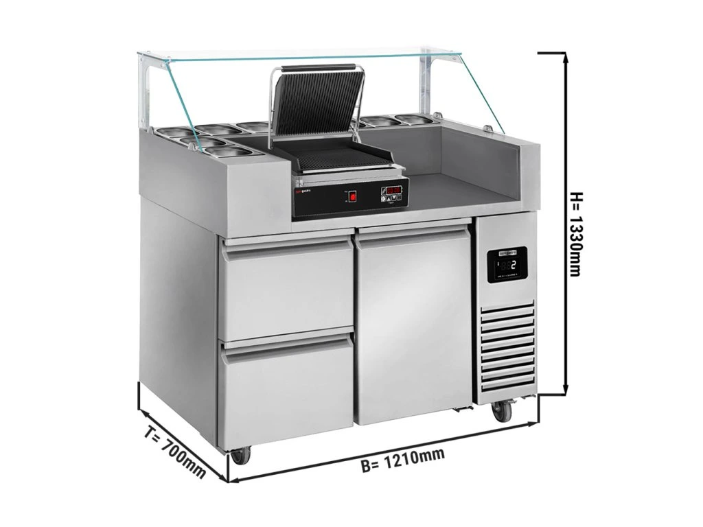 Stół przygotowawczy - 1210 mm - dla 9x GN 1/6 - 1 drzwi i 2 szuflady - włącznie z cyfrowym grillem kontaktowym
