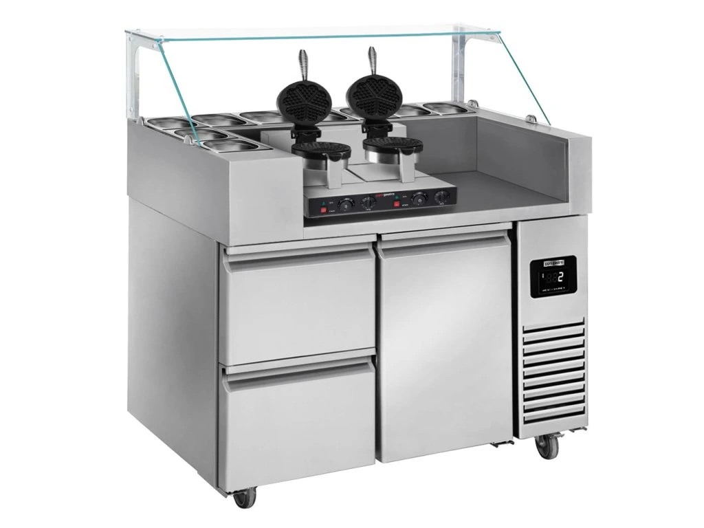 Stół przygotowawczy - 1210 mm - dla 9x GN 1/6 - 1 drzwi i 2 szuflady - włącznie z gofrownicą - w kształcie serca