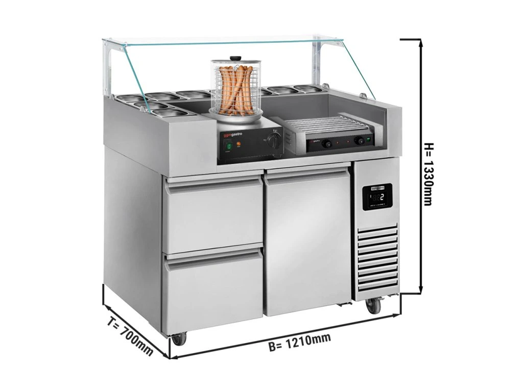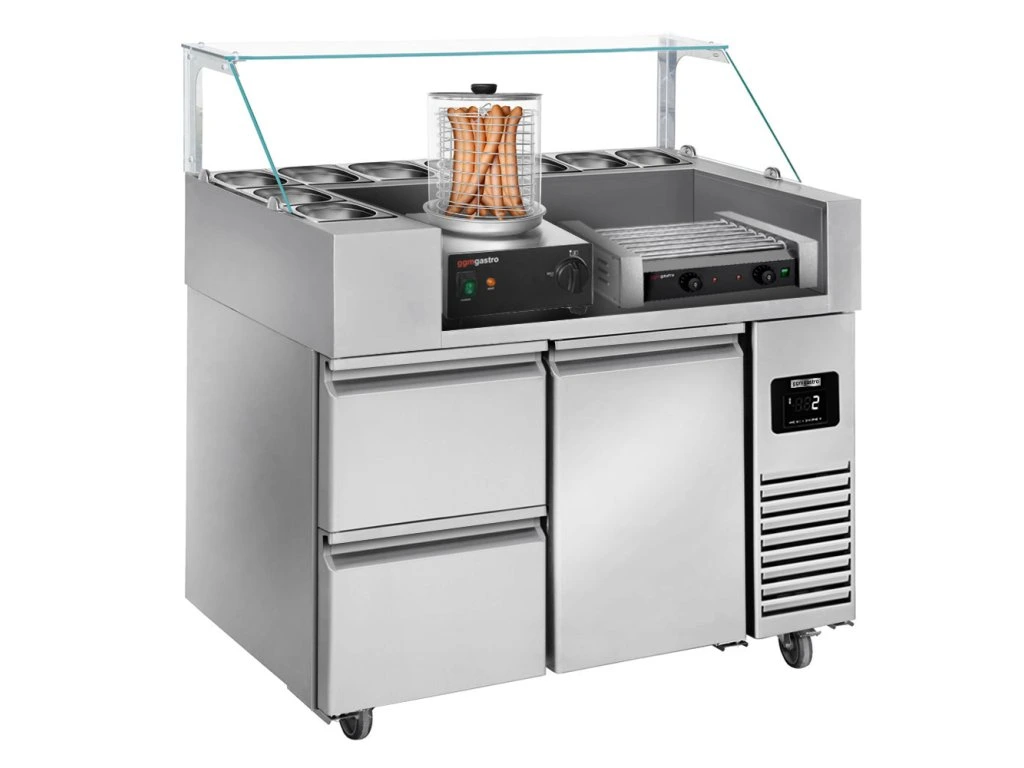 Stół przygotowawczy - 1210 mm - dla 9x GN 1/6 - 1 drzwi i 2 szuflady - włącznie z grillem na kiełbaski i podgrzewaczem