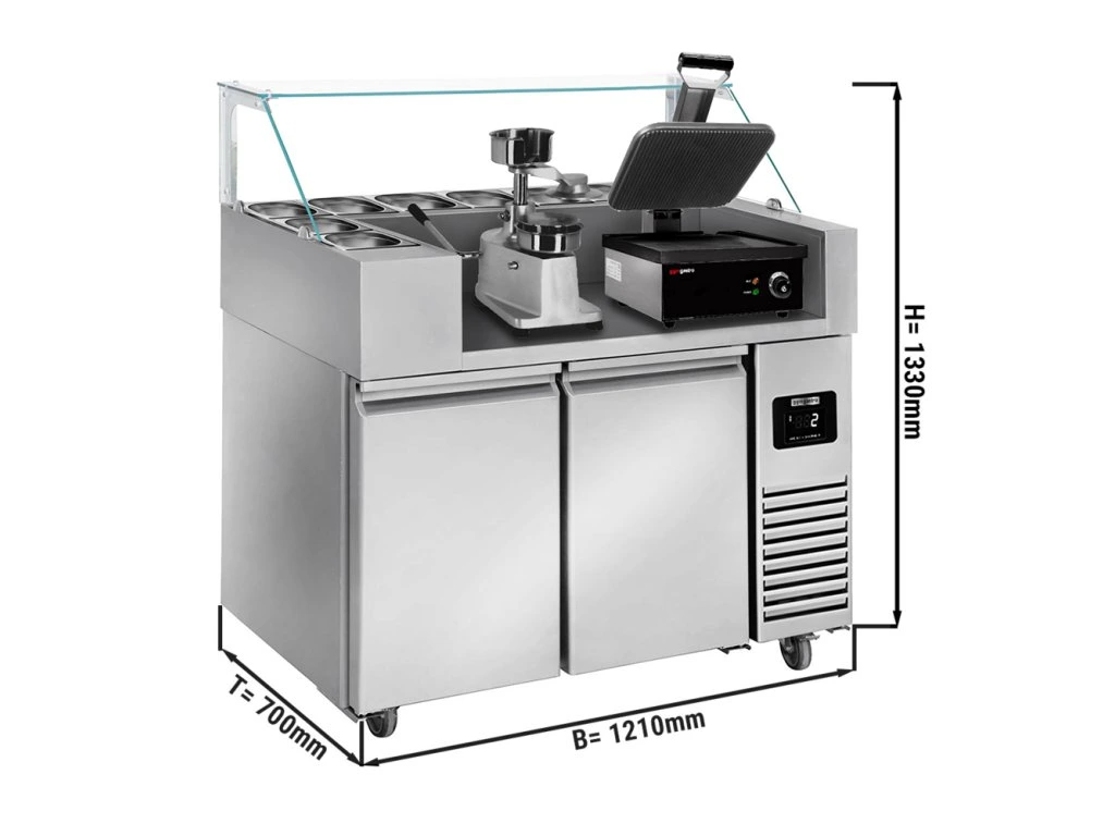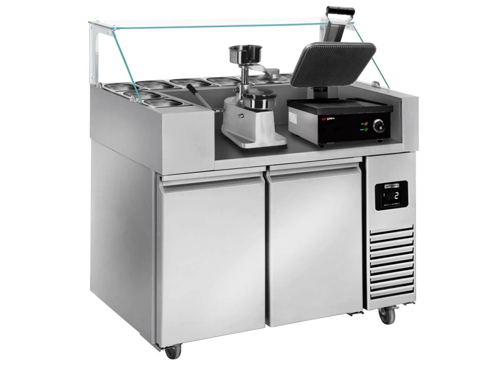 Stół przygotowawczy - 1210 mm - dla 9x GN 1/6 - 2 drzwi - włącznie z grillem kontaktowym i maszyną do hamburgerów