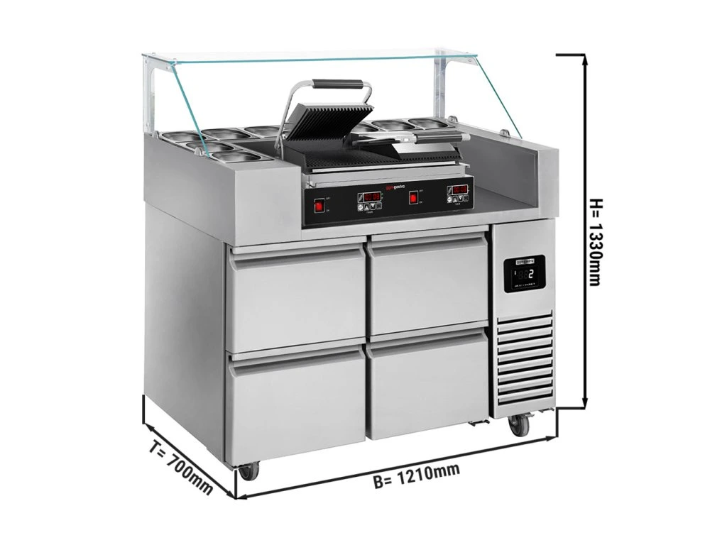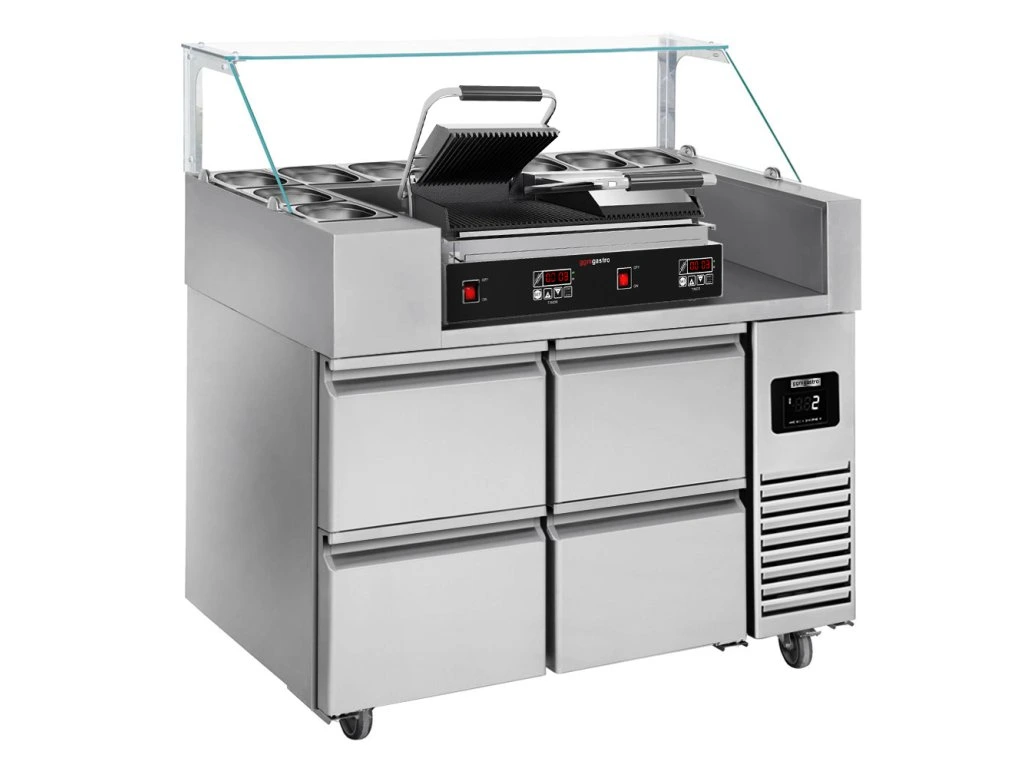 Stół przygotowawczy - 1210 mm - dla 9x GN 1/6 - 4 szuflady - włącznie z grillem kontaktowym