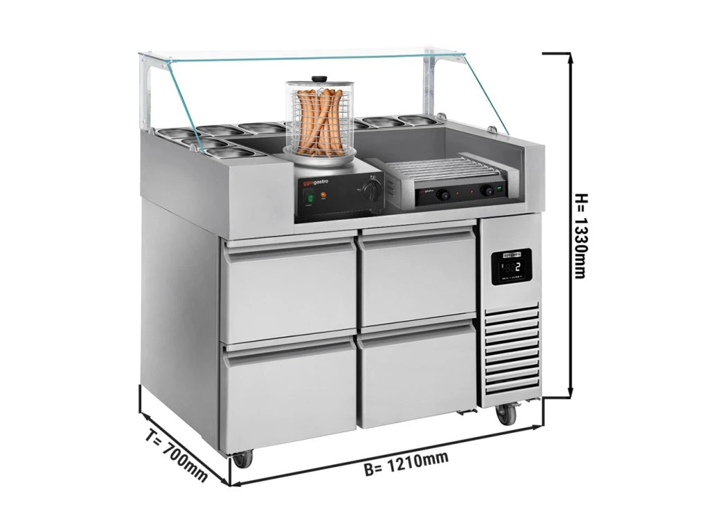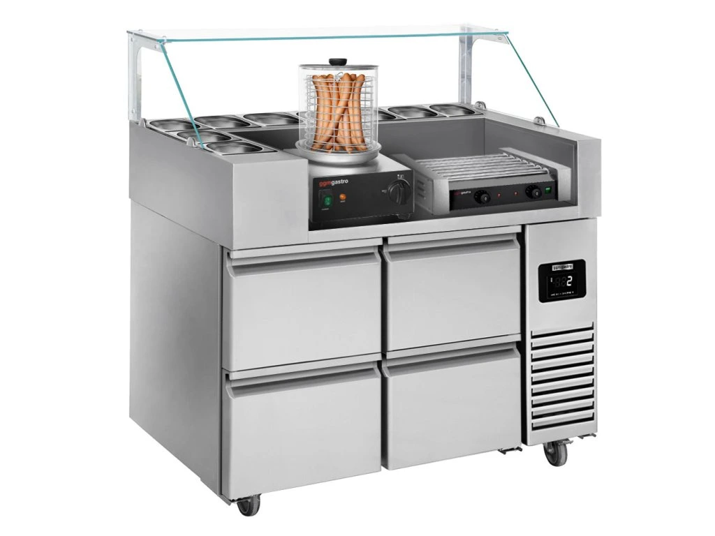 Stół przygotowawczy - 1210 mm - dla 9x GN 1/6 - 4 szuflady - włącznie z grillem na kiełbaski i podgrzewaczem