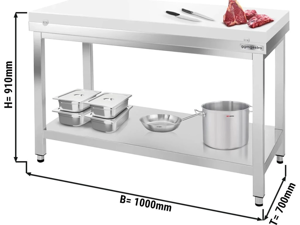 Stół roboczy ze stali nierdzewnej PREMIUM - 1000x700mm - z półką dolną bez panelu tylnego, włącznie z płytą do cięcia