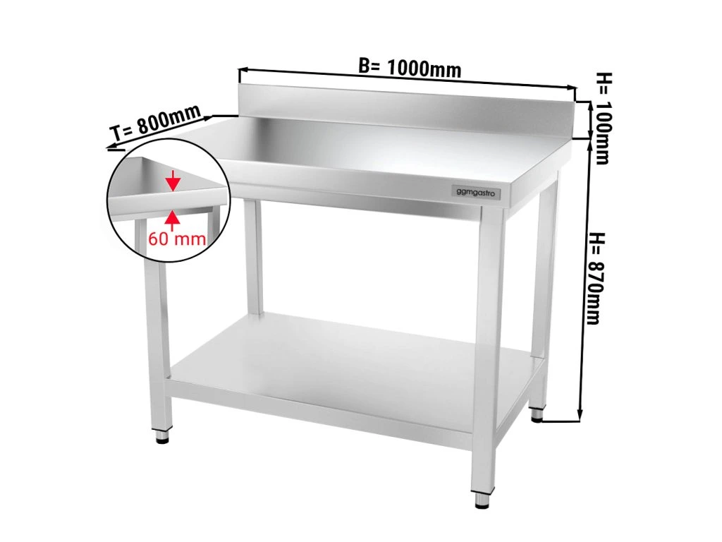 Stół roboczy PREMIUM ze stali nierdzewnej - 1000x800 mm - z półką dolną i panelem tylnym