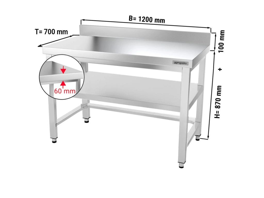 Stół roboczy PREMIUM ze stali nierdzewnej - 1200x700 mm - z podstawą, panelem tylnym i wspornikami