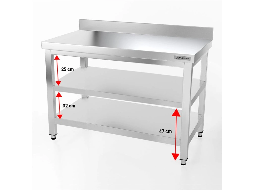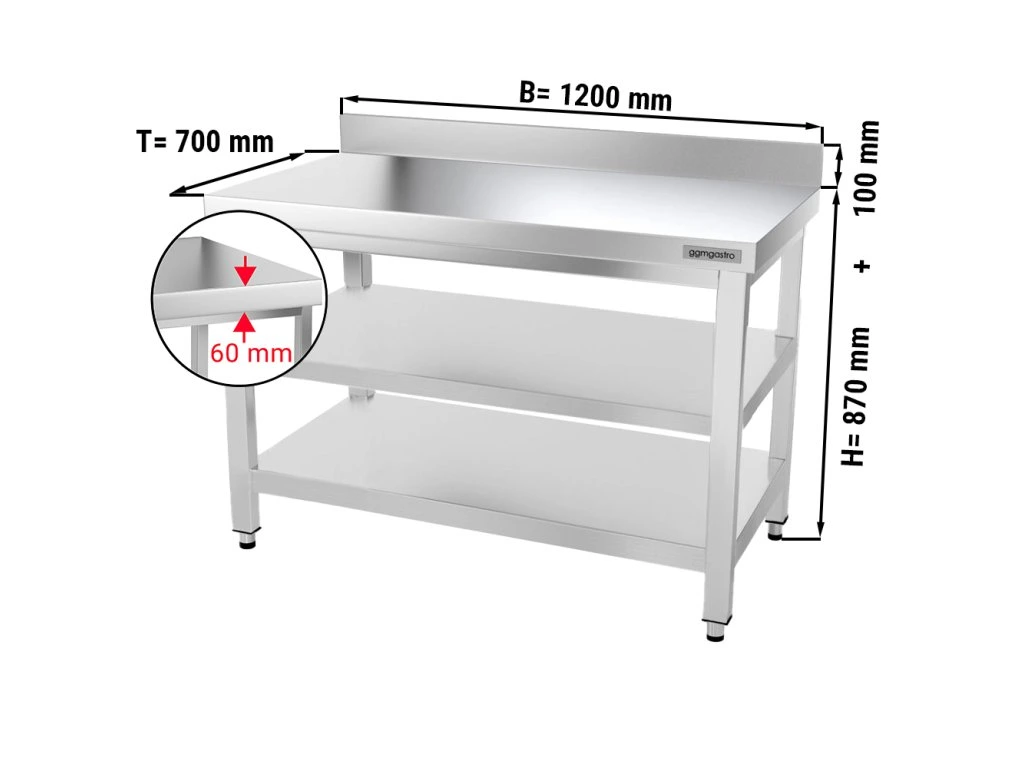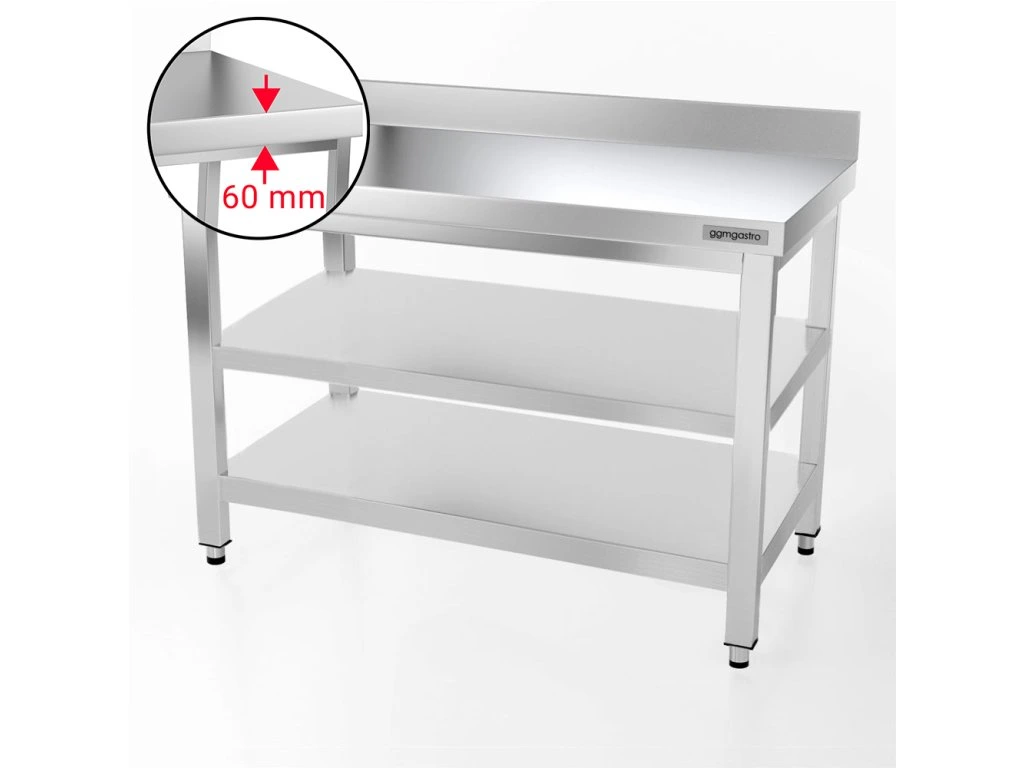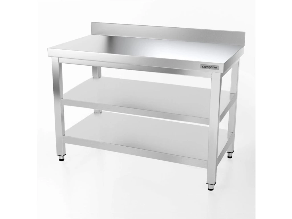 Stół roboczy PREMIUM ze stali nierdzewnej - 1200x700 mm - z półką dolną, panelem tylnym i półką pośrednią