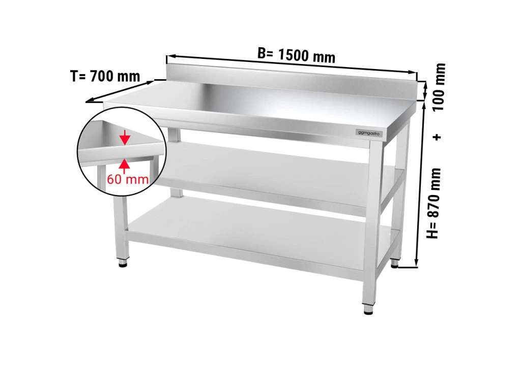 Stół roboczy PREMIUM ze stali nierdzewnej - 1500x700 mm - z półką dolną, panelem tylnym i półką pośrednią