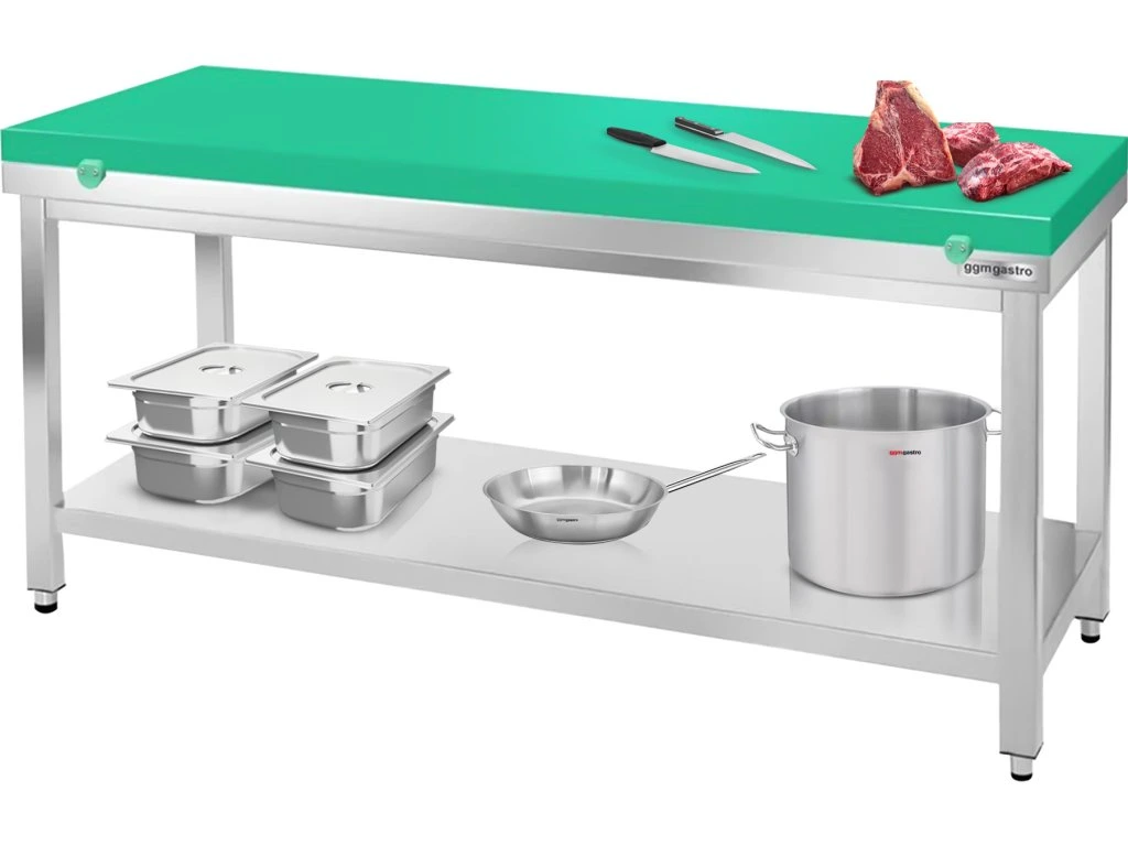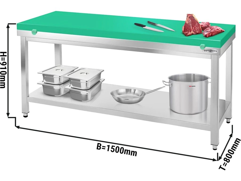 Stół roboczy ze stali nierdzewnej PREMIUM - 1500x800mm - z półką dolną bez panelu tylnego, włącznie z płytą do cięcia
