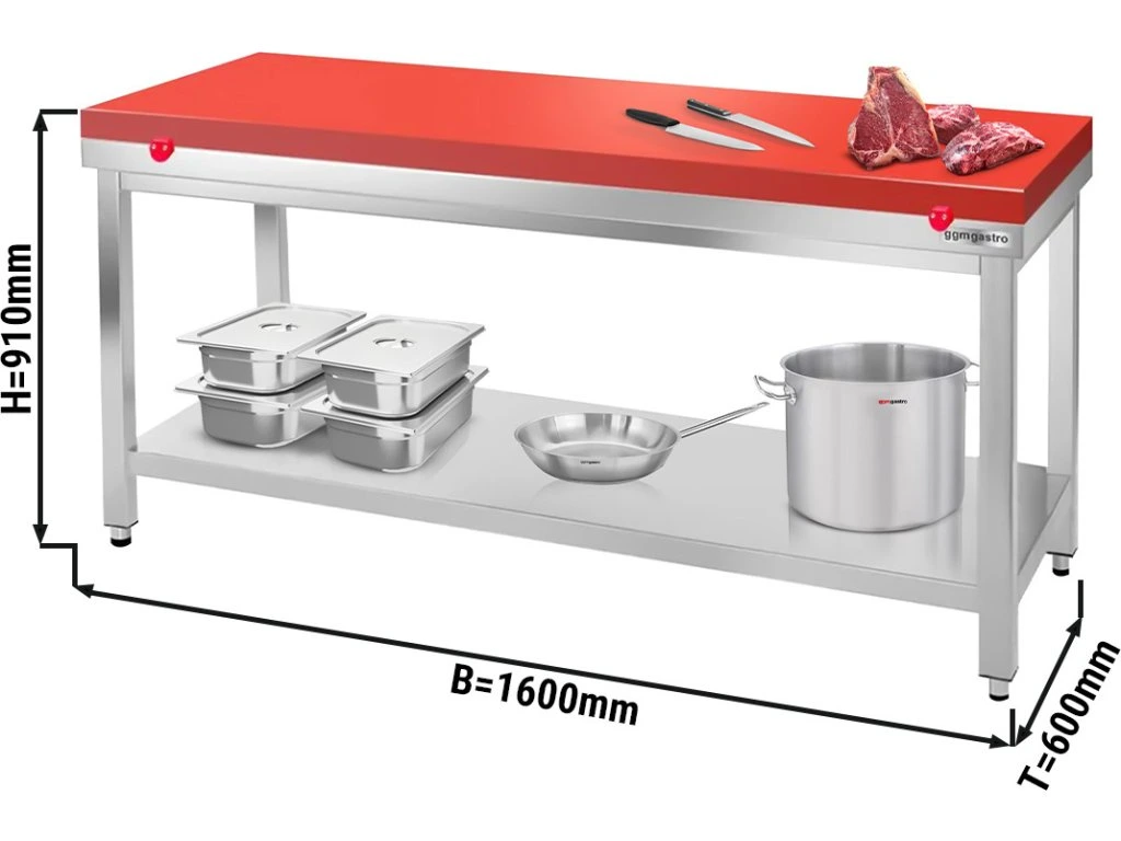 Stół roboczy ze stali nierdzewnej PREMIUM - 1600x600 mm - z półką dolną bez panelu tylnego włącznie z płytą do cięcia