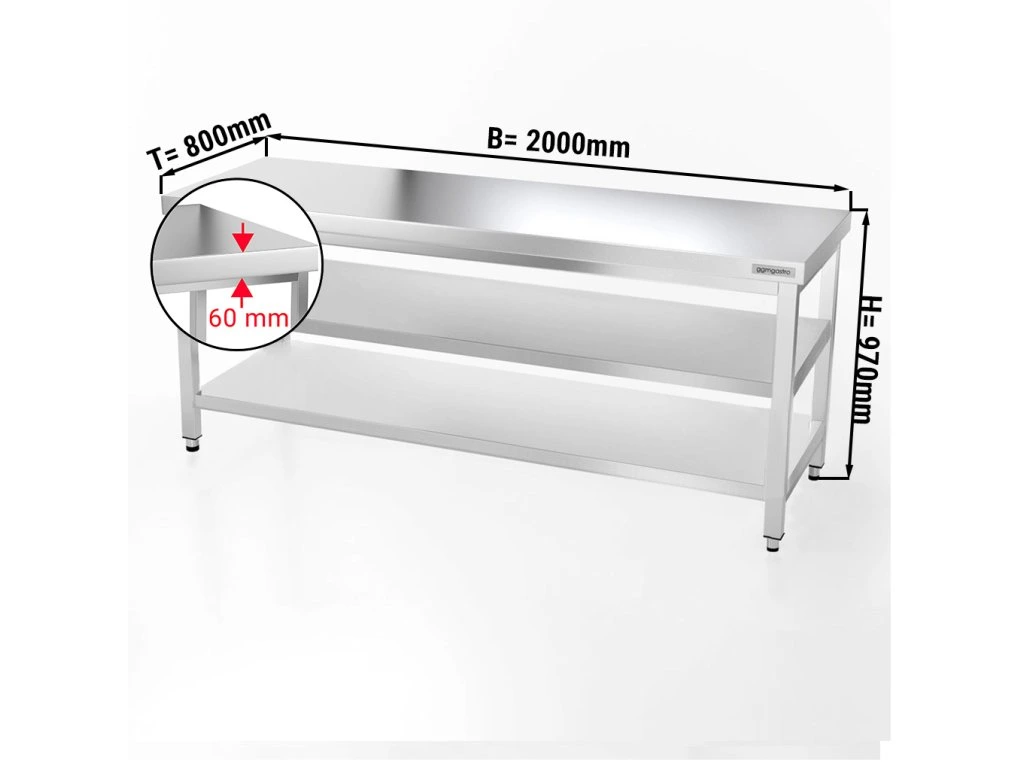 Stół roboczy PREMIUM ze stali nierdzewnej - 2000x800 mm - z półką dolną i półką pośrednią