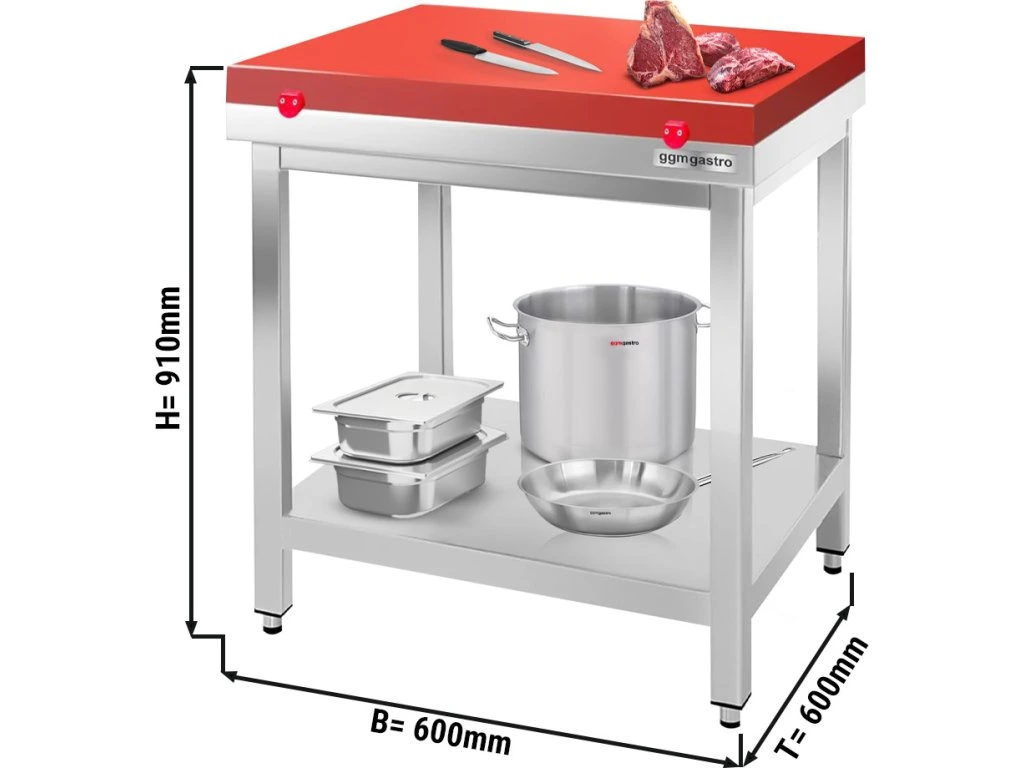 Stół roboczy ze stali nierdzewnej PREMIUM - 600x600 mm - z półką dolną bez panelu tylnego, włącznie z płytą do cięcia