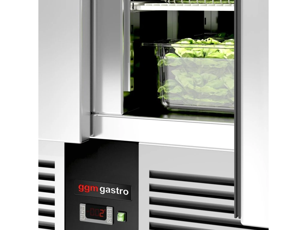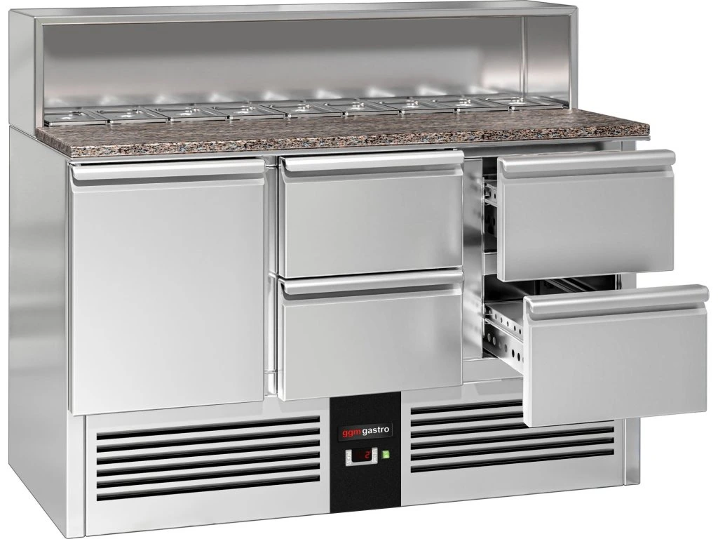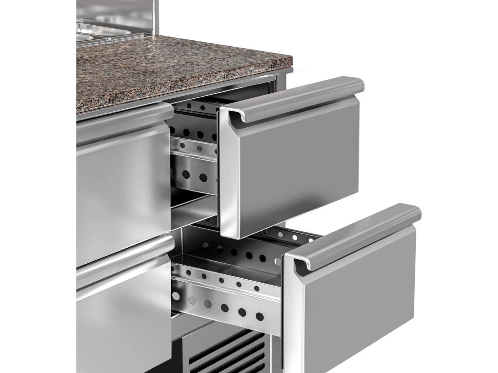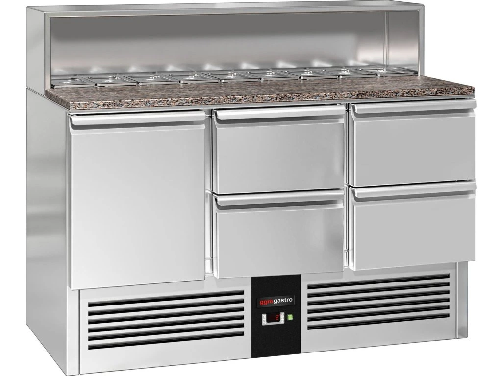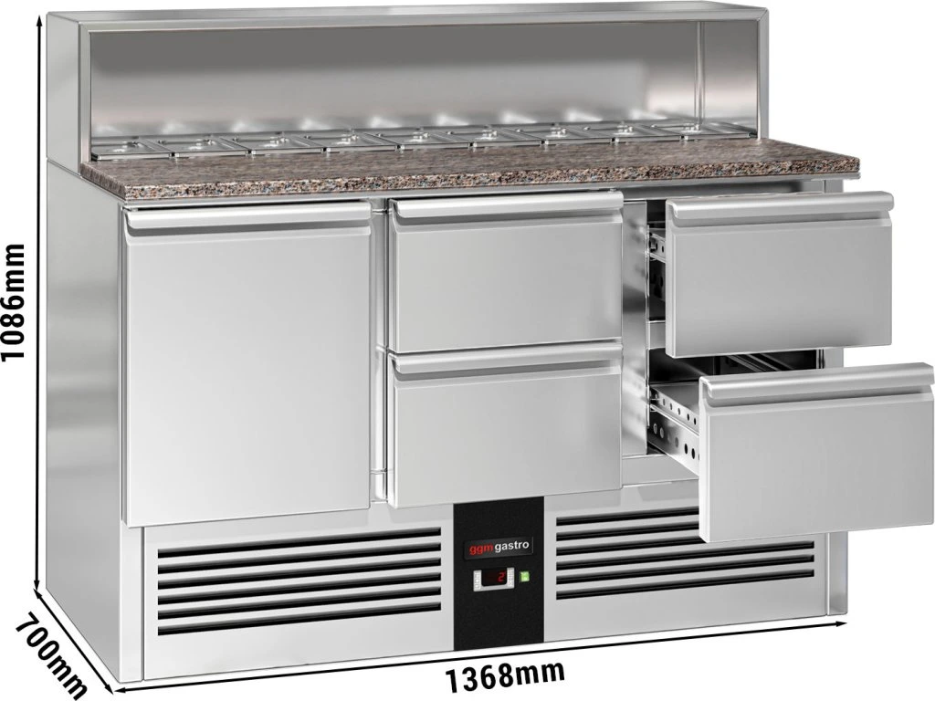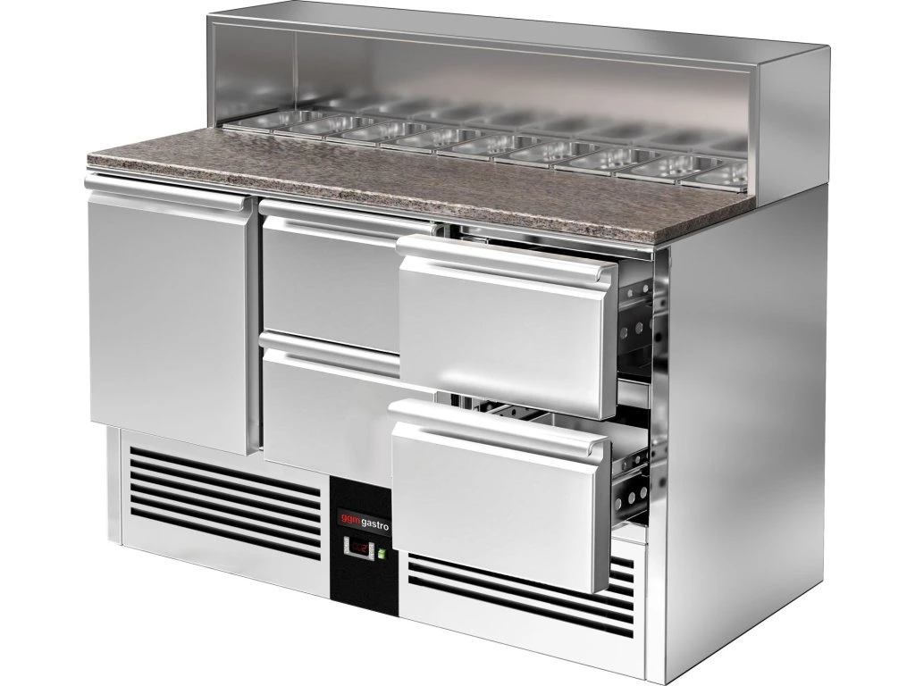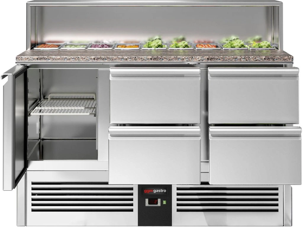 Stół Sałatkowy PREMIUM - 1368 mm -nadstawna ze stali nierdzewnej dla 8x GN 1/6 - 1 drzwi & 4 szuflady
