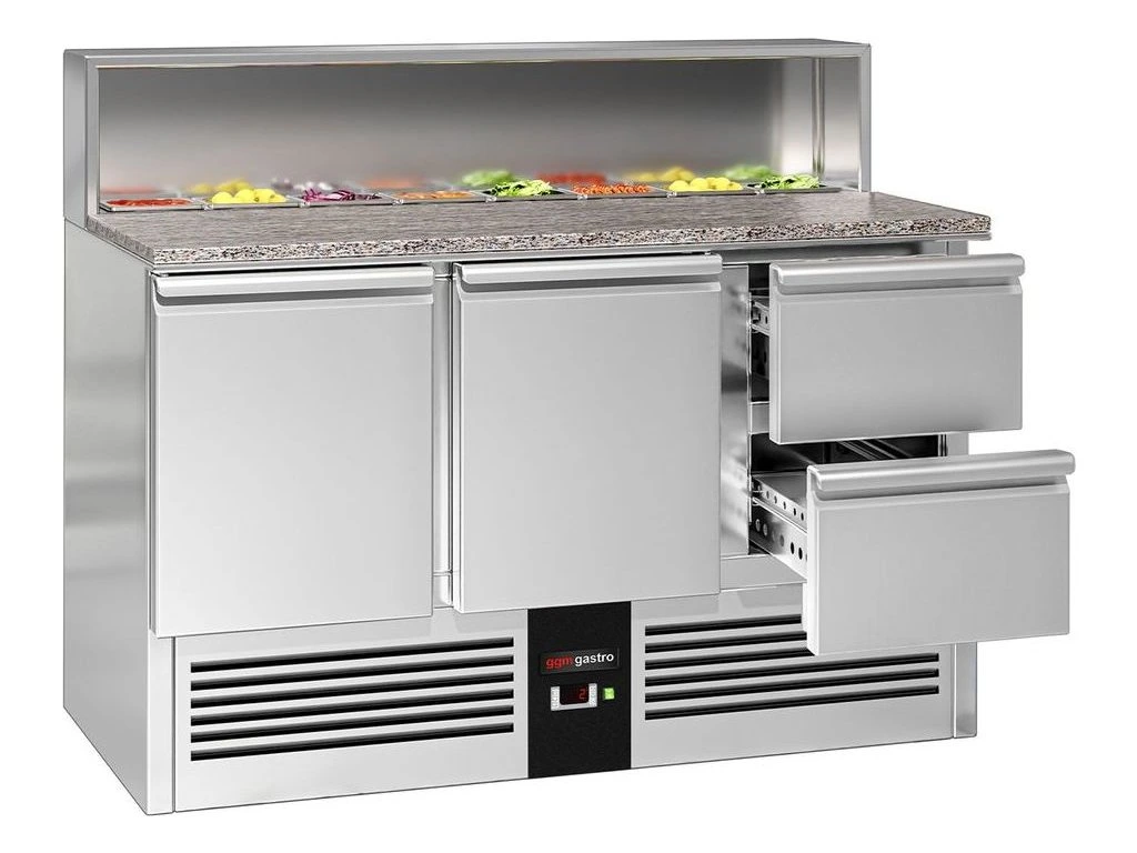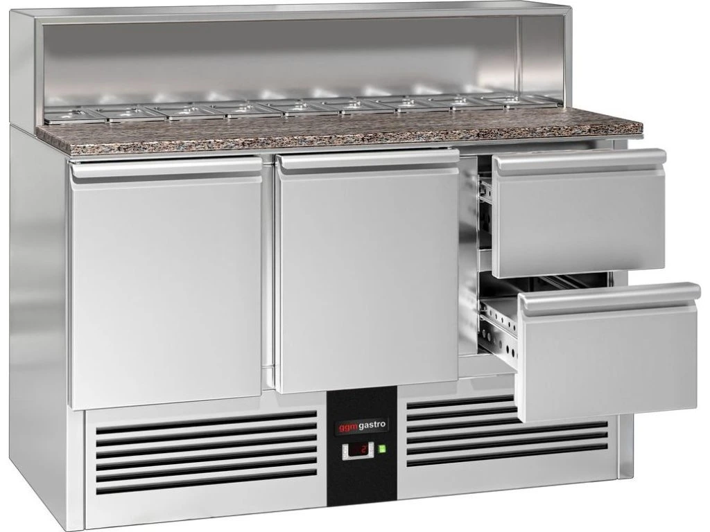 Stół Sałatkowy PREMIUM - 1368 mm - nadstawna ze stali nierdzewnej dla 8x GN 1/6 - 2 drzwi & 2 szuflady