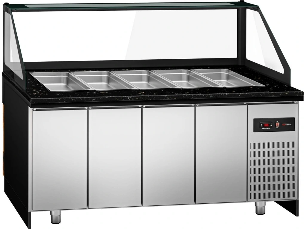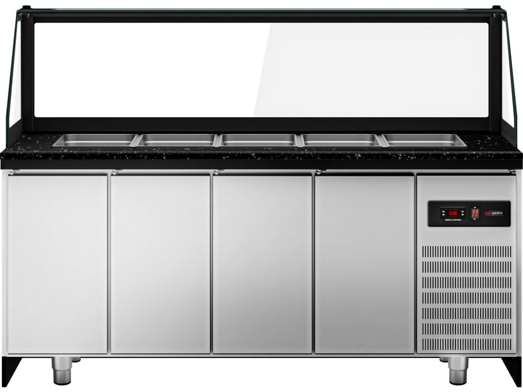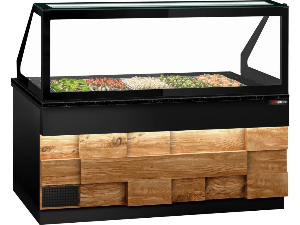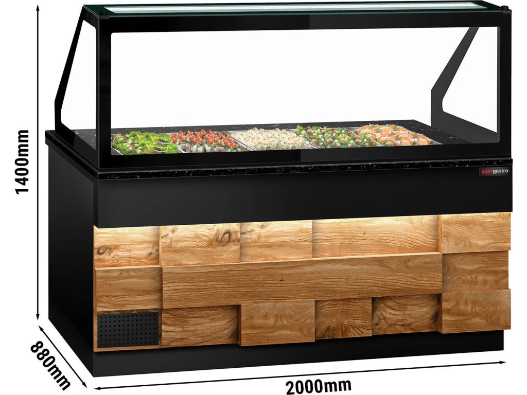 Stół Sałatkowy TORONTO - 2000 mm - drewniany panel przedni - 3 drzwi - do 5x GN 1/1 - blat z czarnego granitu