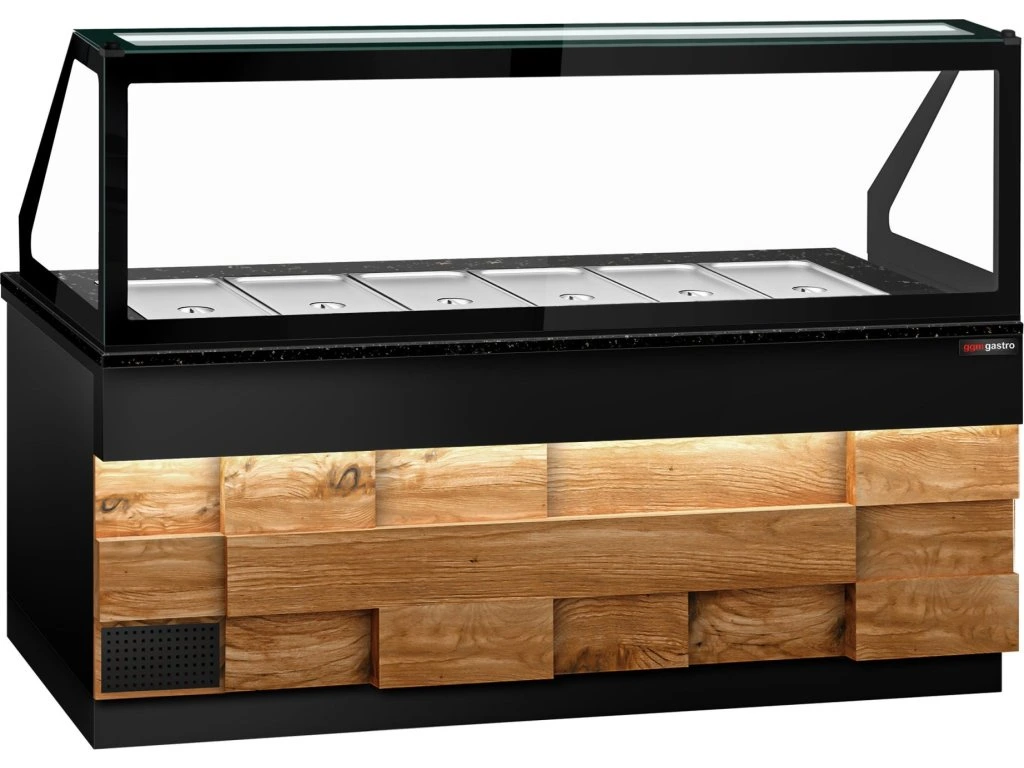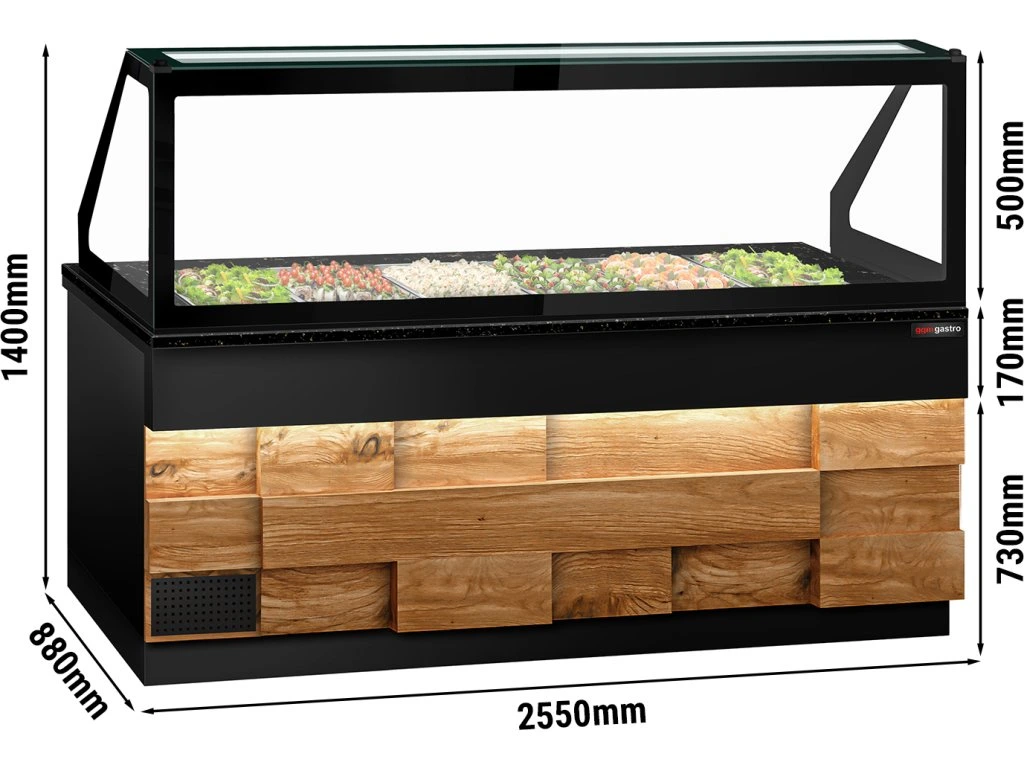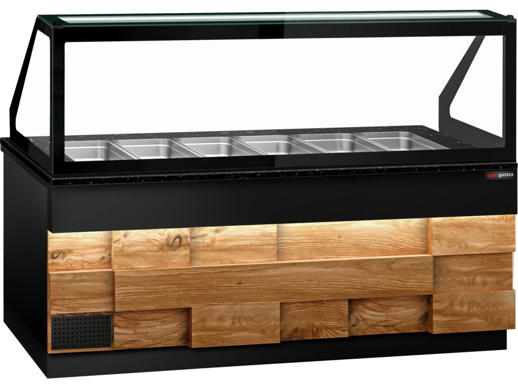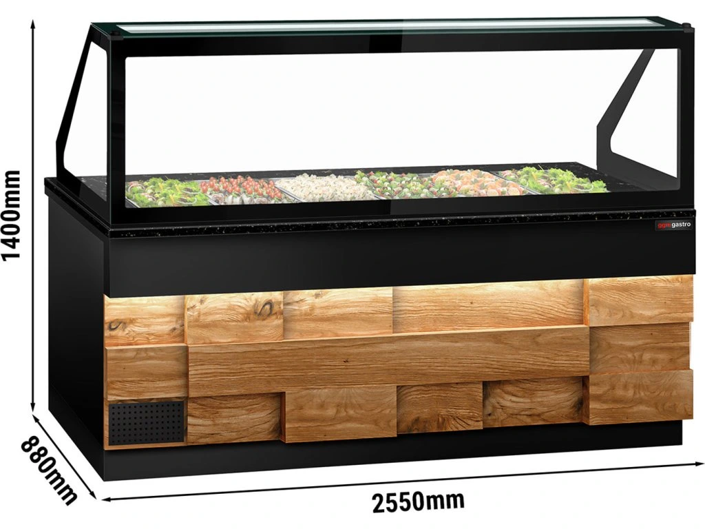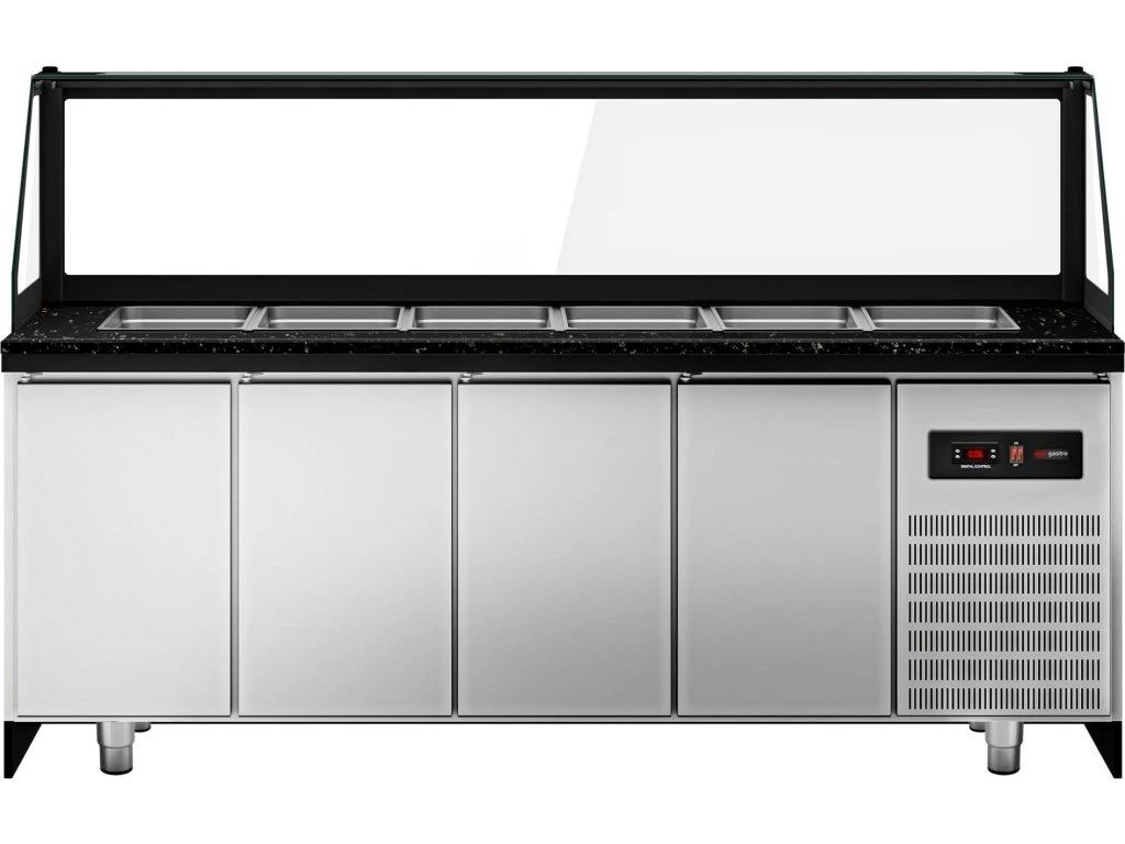 Stół Sałatkowy TORONTO - 2550 mm - drewniany panel przedni - 4 drzwi - dla 6x GN 1/1 - blat z czarnego granitu