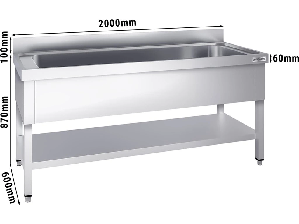Stół zlewozmywakowy do mycia garnków - 2000x600mm - z dolną półką & 1 zlewem