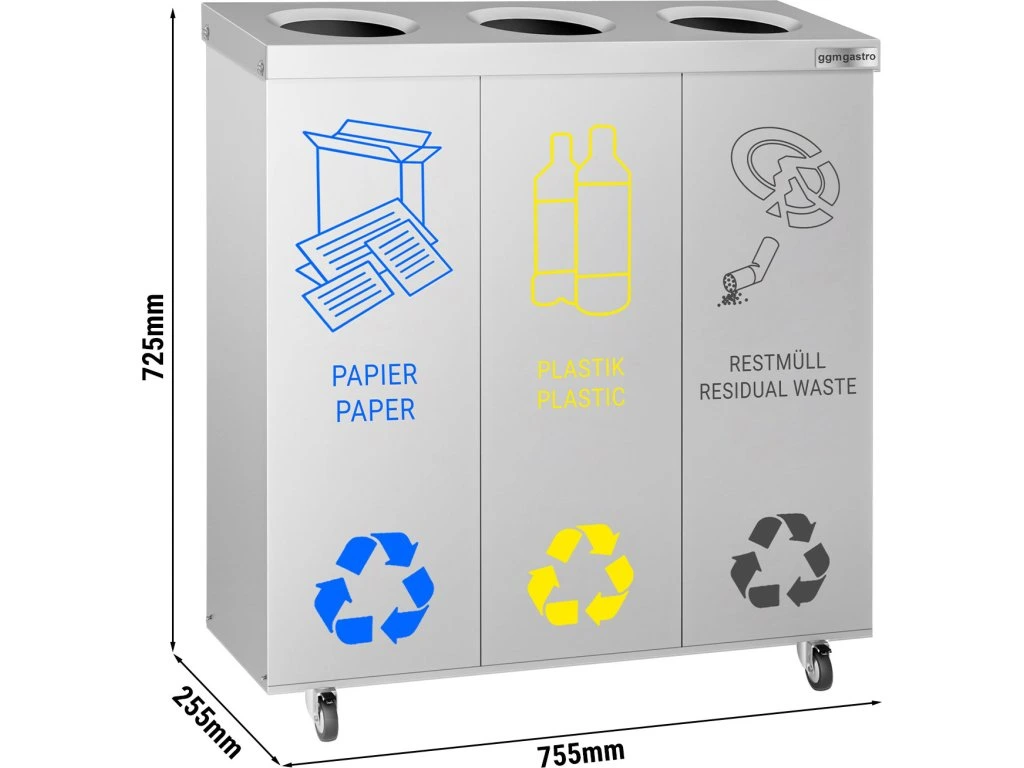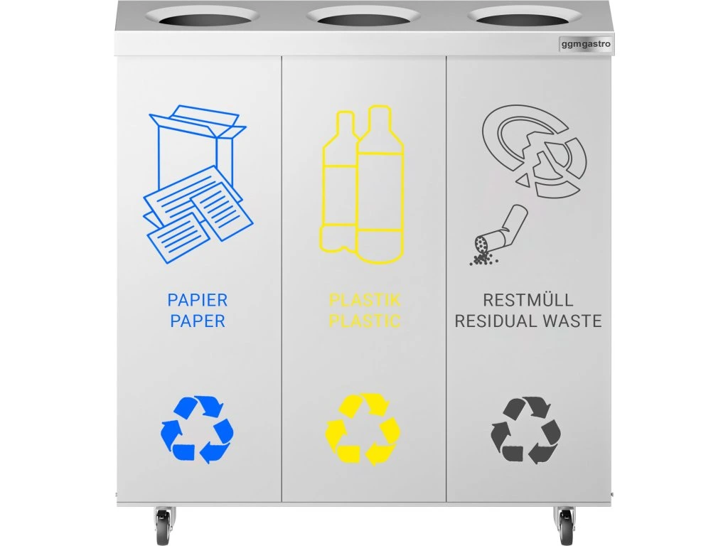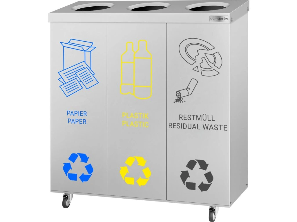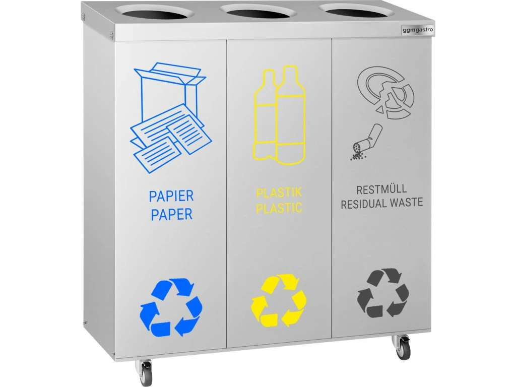 System segregacji odpadów z 3 przedziałami - na kółkach - stal nierdzewna