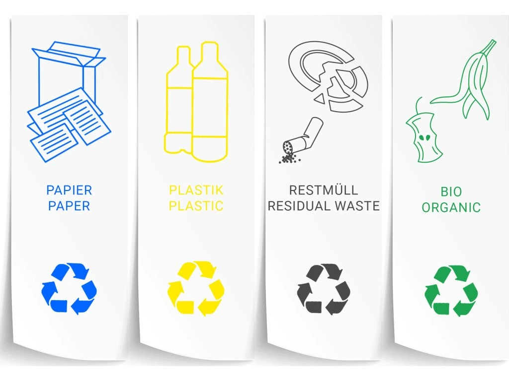 - Zestaw naklejek do segregacji odpadów papierowych, plastikowych, resztkowych i organicznych z piktogramem ułatwiającym rozpoznanie