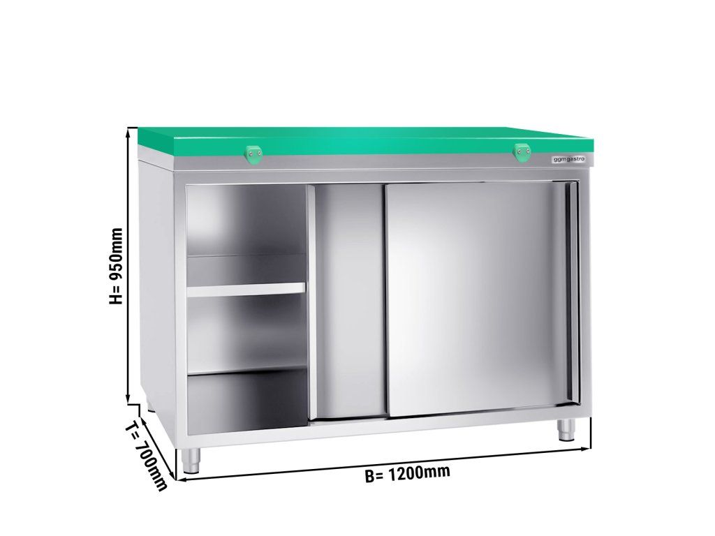 Szafka robocza PREMIUM ze stali nierdzewnej - 1200x700 mm - z drzwiami przesuwnymi bez panelu tylnego, włącznie z płytą do cięcia