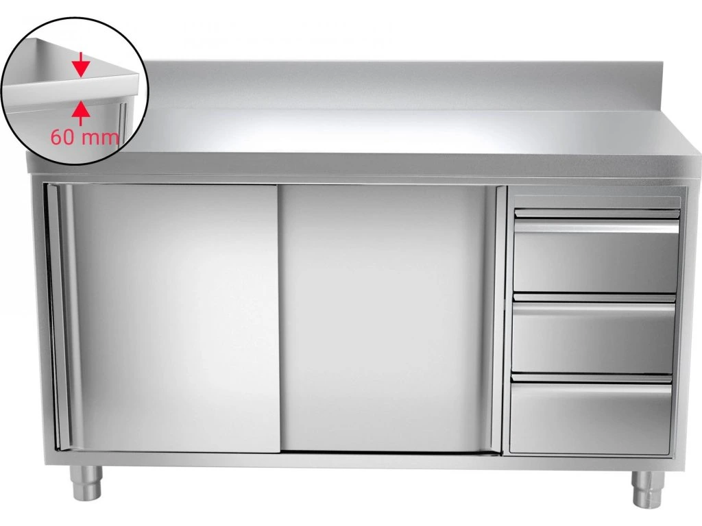 Szafka robocza PREMIUM ze stali nierdzewnej - 1400x600 mm - z 3 szufladami po prawej stronie & panelem tylnym