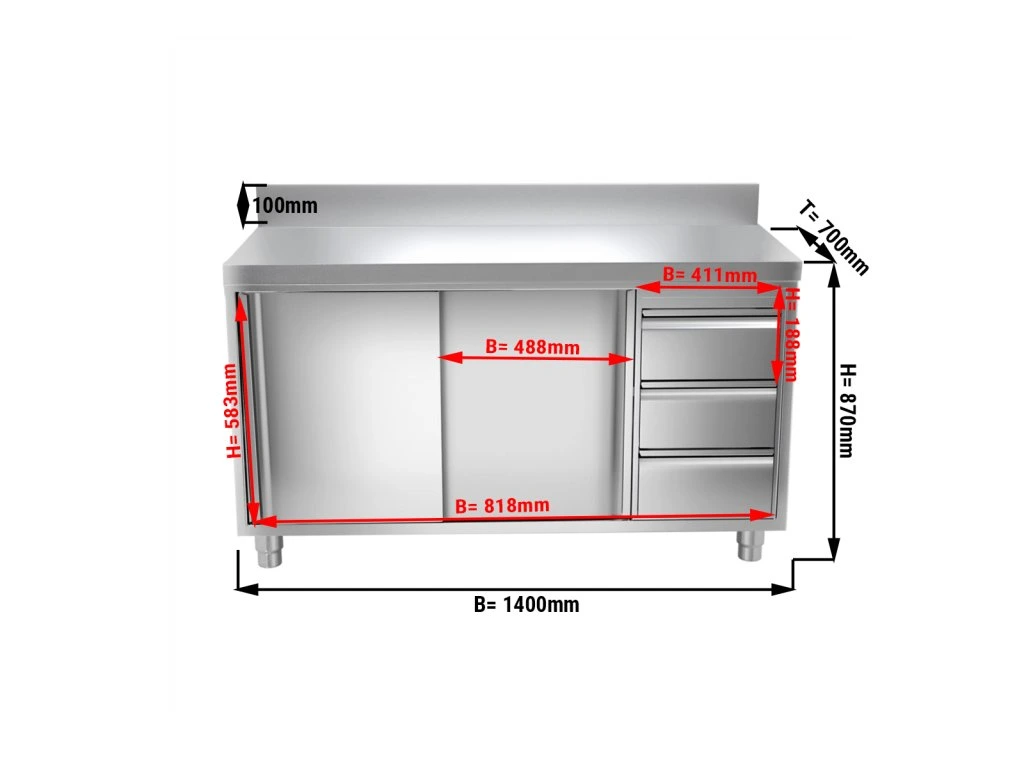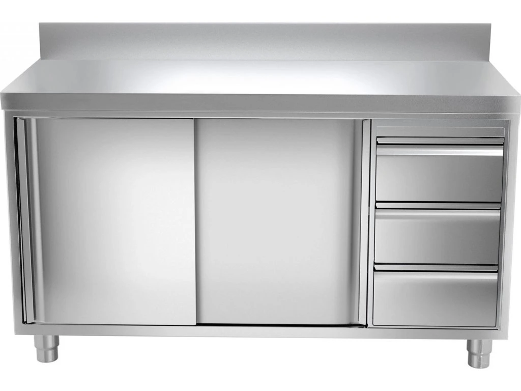 Szafka robocza PREMIUM ze stali nierdzewnej - 1400x700 mm - z 3 szufladami po prawej stronie & panelem tylnym