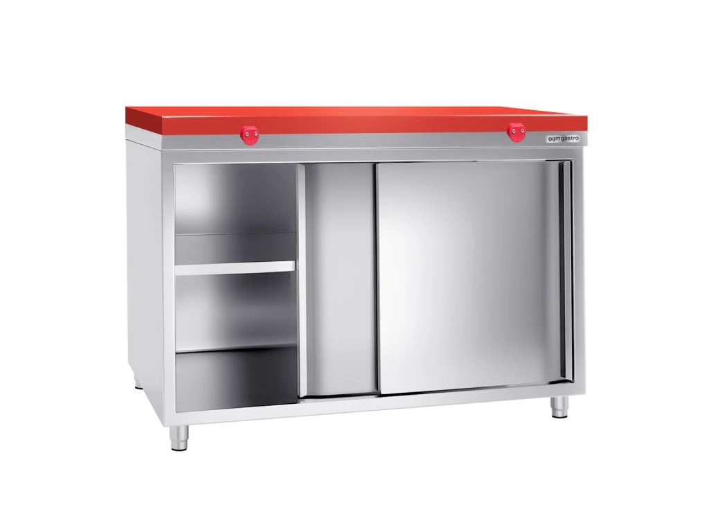 Szafka robocza PREMIUM ze stali nierdzewnej - 1400x800 mm - z drzwiami przesuwnymi bez panelu tylnego, włącznie z płytą do cięcia