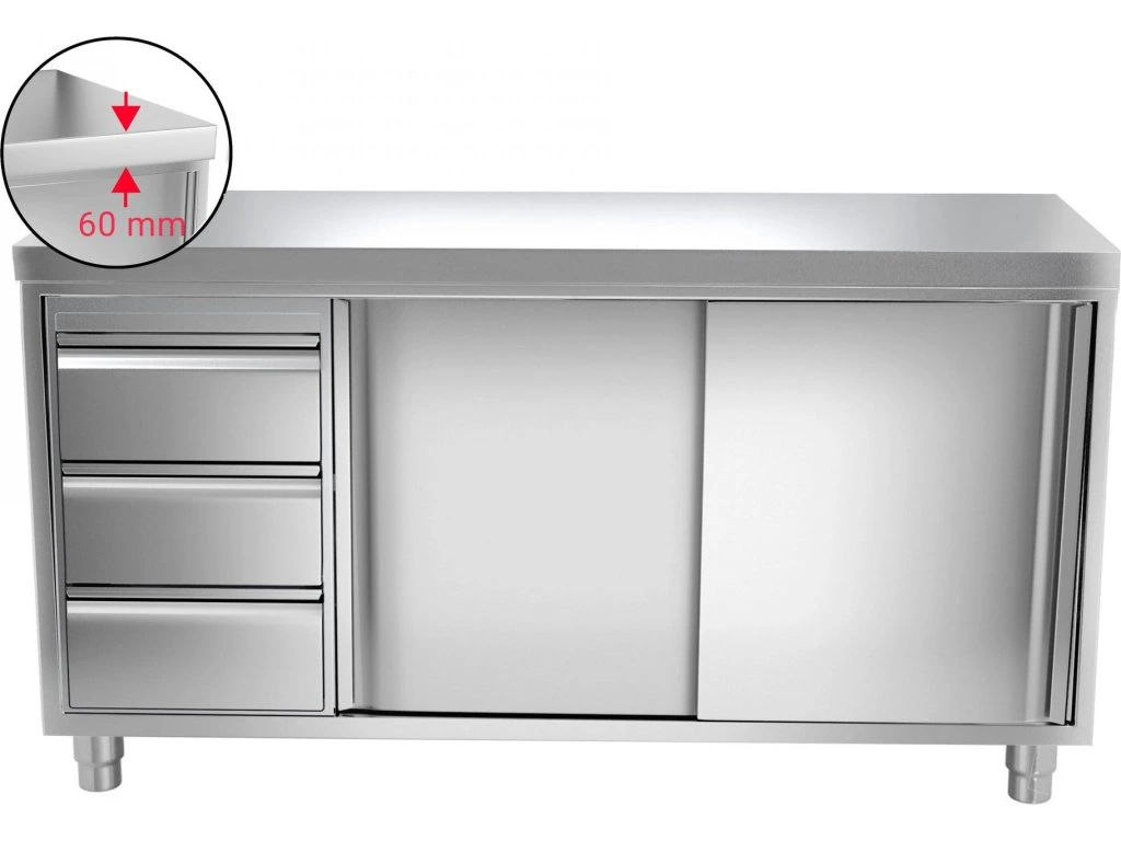 Szafka robocza PREMIUM ze stali nierdzewnej - 1800x600 mm - z 3 szufladami po lewej stronie bez panelu tylnego