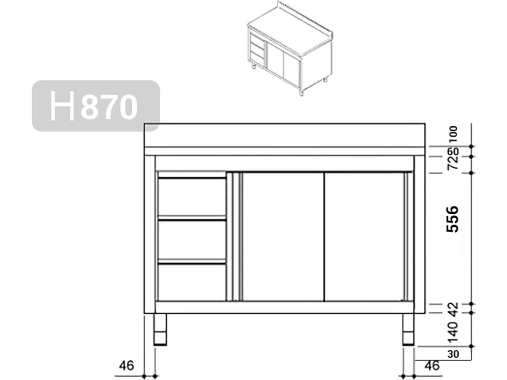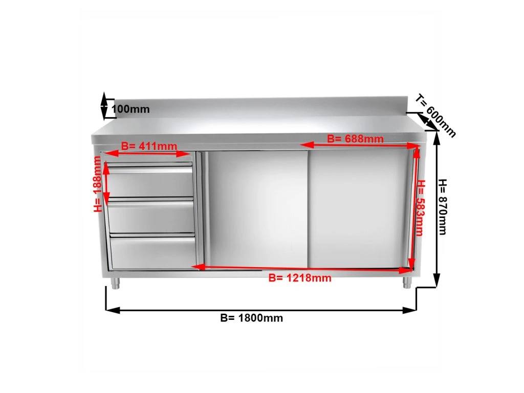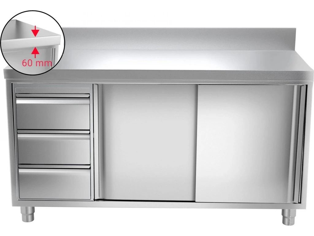 Szafka robocza PREMIUM ze stali nierdzewnej - 1800x600 mm - z 3 szufladami po lewej stronie & panelem tylnym