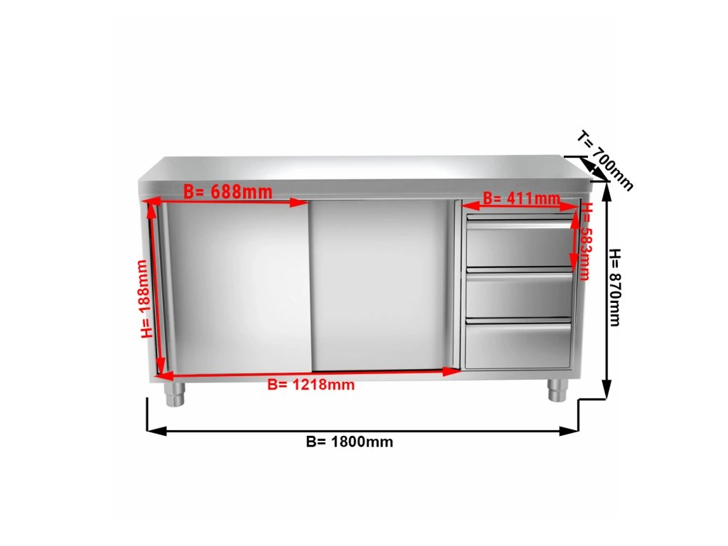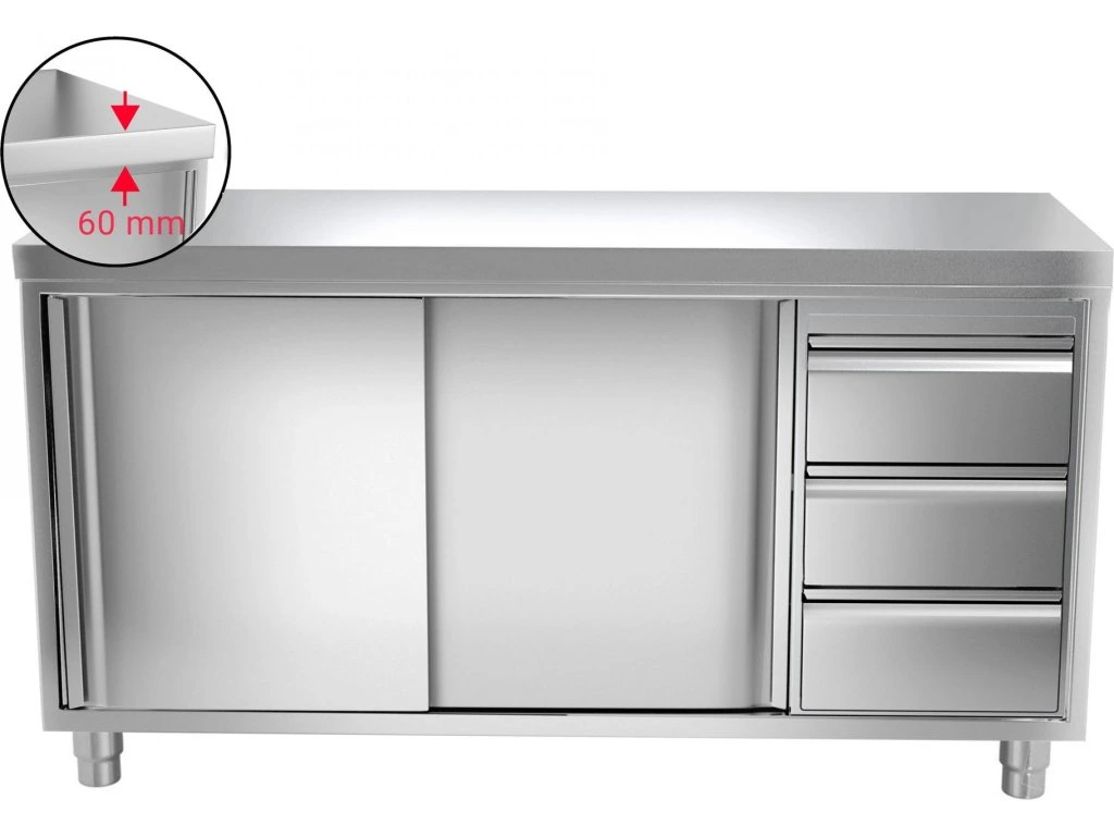 Szafka robocza PREMIUM ze stali nierdzewnej - 1800x700 mm - z 3 szufladami po prawej stronie bez panelu tylnego