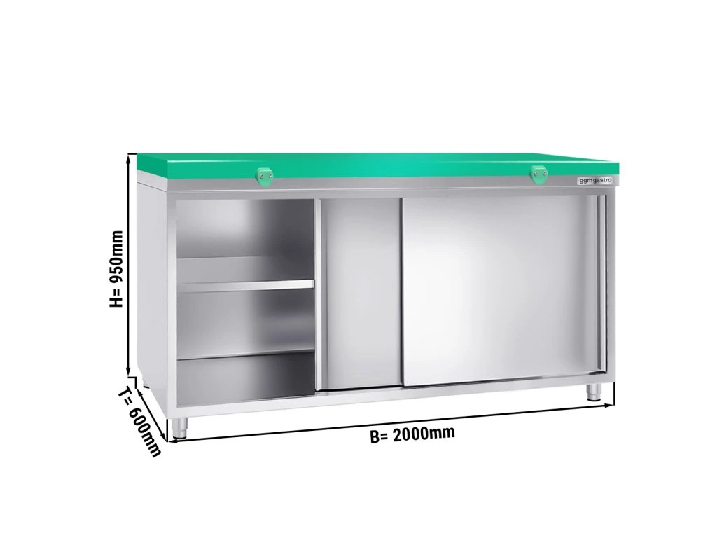 Szafka robocza PREMIUM ze stali nierdzewnej - 2000x600mm - z drzwiami przesuwnymi bez panelu tylnego, włącznie z płytą do cięcia