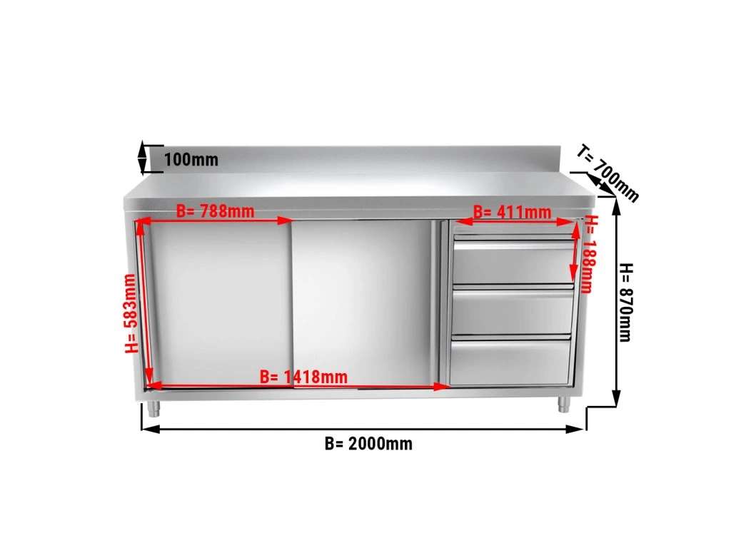 Szafka robocza PREMIUM ze stali nierdzewnej - 2000x700 mm - z 3 szufladami po prawej stronie & panelem tylnym