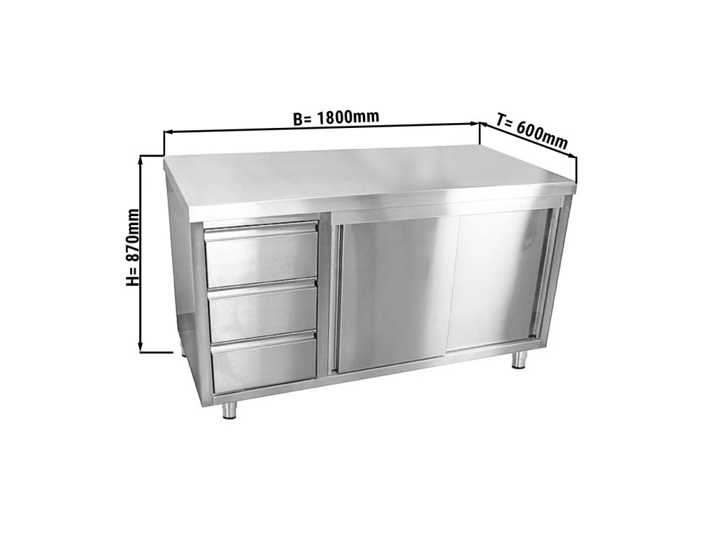 Szafka robocza ze stali nierdzewnej ECO - 1800x600 mm - z 3 szufladami po lewej stronie bez panelu tylnego