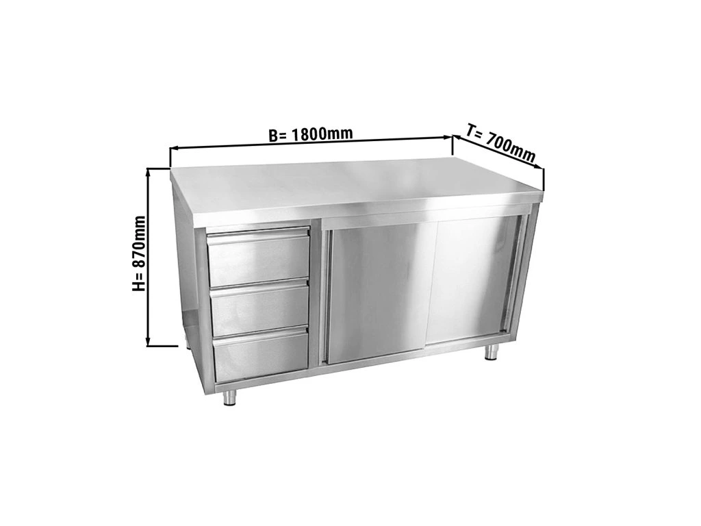 Szafka robocza ze stali nierdzewnej ECO - 1800x700 mm - z 3 szufladami po lewej stronie bez panelu tylnego