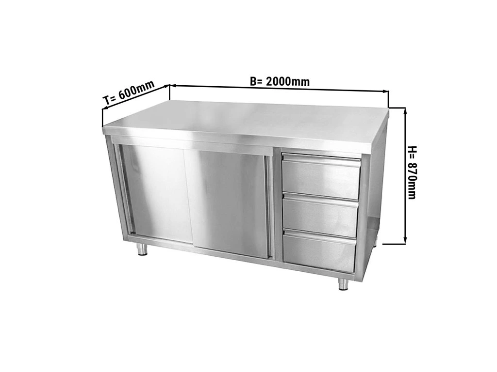 Szafka robocza ze stali nierdzewnej ECO - 2000x600 mm - z 3 szufladami po prawej stronie bez panelu tylnego
